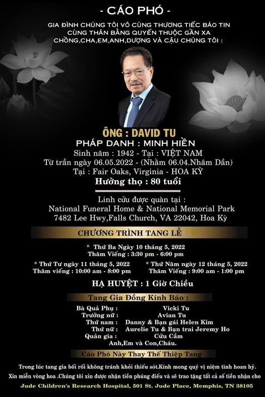 | THÀNH KÍNH PHÂN ƯU Nhận được tin buồn Ông DAVID TU Pháp danh MINH HIỀN phu quân của Nhà thơ Hoàng Phượng đã từ trần ngày 6 tháng 5 năm 2022 tại Virginia Hưởng Thọ 80 tuổi Xin thành kính chi buồn Nhà thơ Hoàng Phượng và tang quyến. Xin nguyện cầu hương linh người quá cố vãng sanh cực lạc quốc, hoa khai kiến Phật. Thành Kính Phân Ưu Gia đình Vũ Hối Gia đình Phan Khâm |