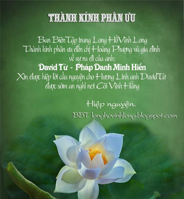 | Thành kính phân ưu với bà Quả Phụ Vịcky Từ(Hoàng Phượng) và tang quyến. Nguyện cầu Hương Linh ông David Từ sớm siêu sinh,tịnh độ Cõi Vĩnh Hằng. Đào Hiếu Thảo và Thuận |