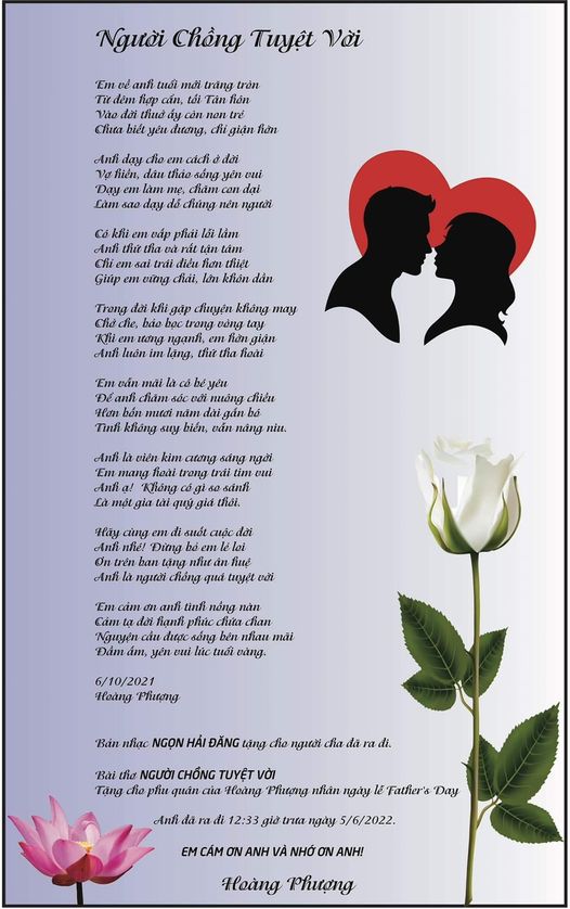 | THIÊN THU VẪN CÒN Chung bóng chung tim chung hồn yêu Chia ngọt xẻ bùi chung nâng niu Chưa trọn ân tình đau vĩnh biệt Kỷ niệm ngọt ngào chiêm bao nhiêu… MD.05/13/22 Thân cảm tặng”DĨ VÃNG” của TG.TS HOÀNG PHƯỢNG |
