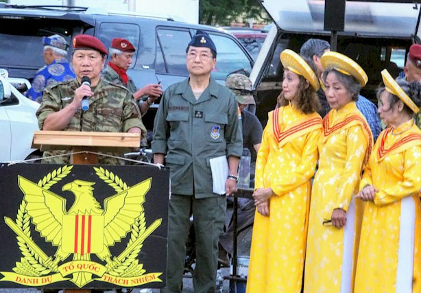 Hình Nguyễn Quang Dũng Ông Đoàn Hữu Định thay mặt Liên Hội Cựu Chiến Sĩ phát biểu cảm tưởng về ý nghĩa Ngày Quân Lực 19 tháng 6.
