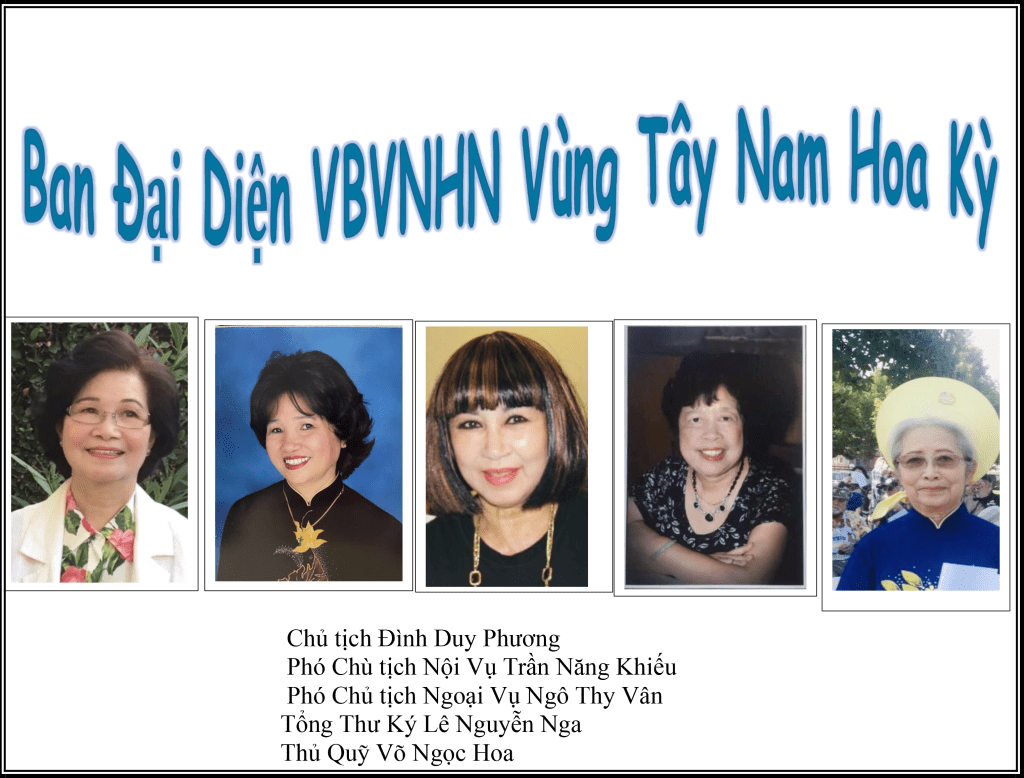 | THÔNG BÁO MÃN NHIỆMNHIỆM KỲ 2020-2023 . Nam California, ngày 28 tháng 7 năm 2023 Kính gửi: Toàn thể Hội viên Văn Bút Việt Nam Hải Ngoại (VBVNHN) Vùng Tây Nam Hoa Kỳ Sau ba năm hoạt động và đại diện VBVNHN vùng Tây Nam (từ ngày 29/ 5/ 2020 đến hạ tuần tháng 7 năm 2023) Nay nhiệm kỳ của chúng tôi đã mãn, Xin kính gửi thông báo và gửi lời tri ân đến toàn quý Văn Thi Hữu Văn Bút Việt Nam Hải Ngoại Vùng Tây Nam Hoa Kỳ. Ban Đại Diện VBVNHN Vùng Tây Nam H.Kỳ: – Đình Duy Phương, Chủ Tịch – Đinh Mộng Lân, Phó CT Nội Vụ – Huỳnh Nguyệt Ngân , Phó CT Ngoại Vụ – Lê Nguyễn Nga , Tổng Thư Ký – Võ Ngọc Hoa , Thủ Quỹ *** Thông báo này chúng tôi đồng đệ trình: Chủ Tịch Ban Chấp Hành Văn Bút Việt Nam Hải Ngoại Trung Ương. Cố Vấn VBVNHN Vùng Tây Nam và Thành Viên Văn Bút Việt Nam Hải Ngoại Vùng Tây Nam Hoa Kỳ. Trân trọng, VH Đình Duy Phương – Chủ Tịch VBVNHN Vùng Tây Nam Hoa Kỳ. |