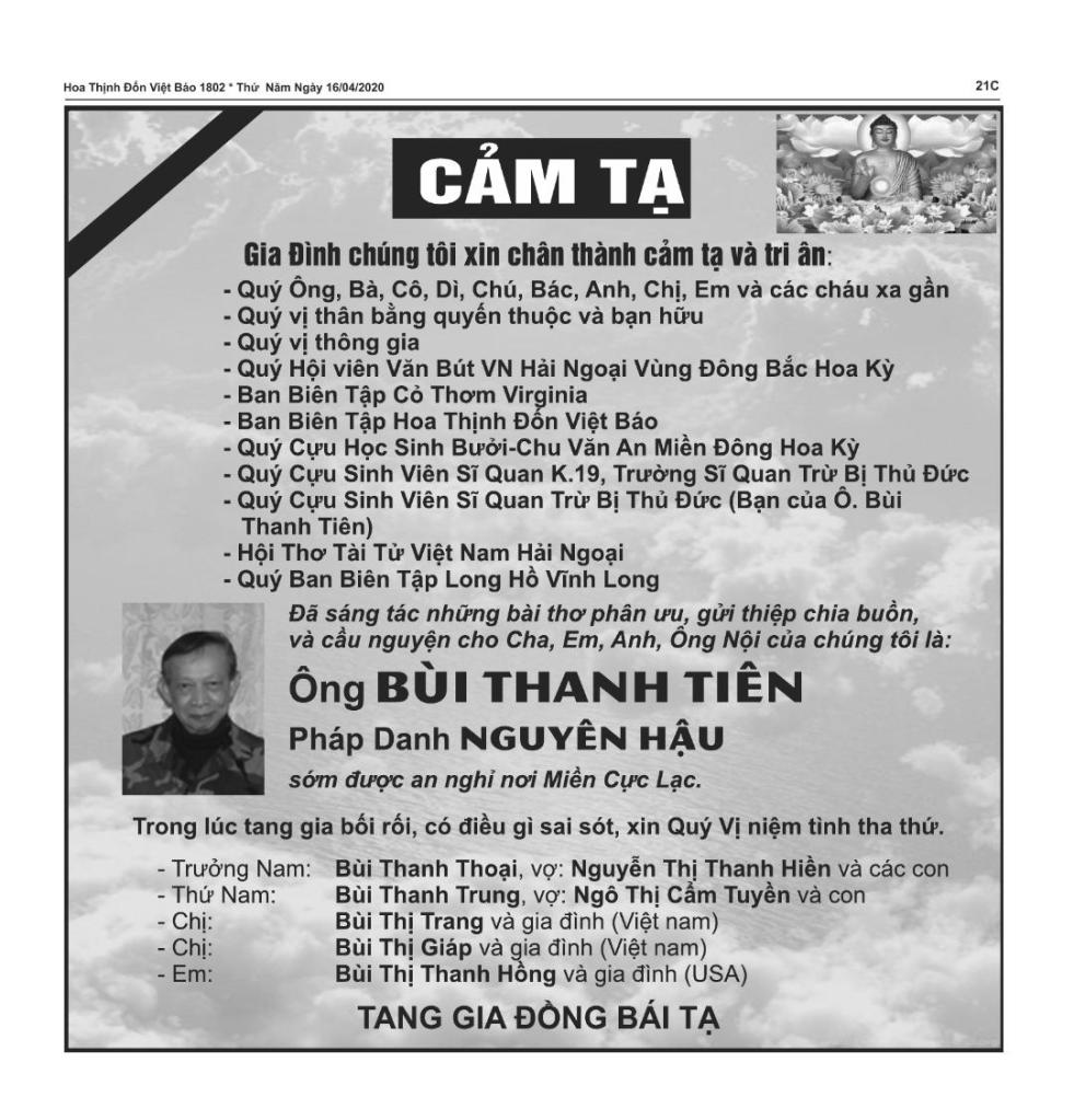 | Tiểu Sử thi sĩ Bùi Thanh Tiên Tên thật : Bùi Thanh Tiên Sinh ngày 15 tháng 2 năm 1943 tại Châu Đốc Cựu học sinh Chu Văn An Khóa 19 Sĩ Quan Trừ Bị Thủ Đức Ban Biên tập Tam Cá Nguyệt Can Cỏ Thơm Virginia Hội viên Hội Thơ Tài Tử Việt Nam Hải Ngoại Ban Đại Diện Văn Bút Hải Ngoại Vùng Đông Bắc Hoa Kỳ |