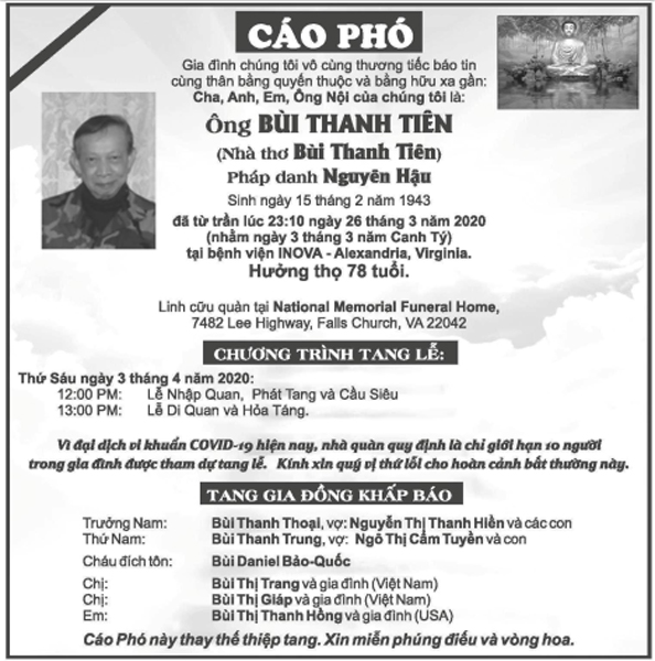 Sinh ngày 15 tháng 2 năm 1943 – Tạ thế ngày 26 tháng 3 năm 2020