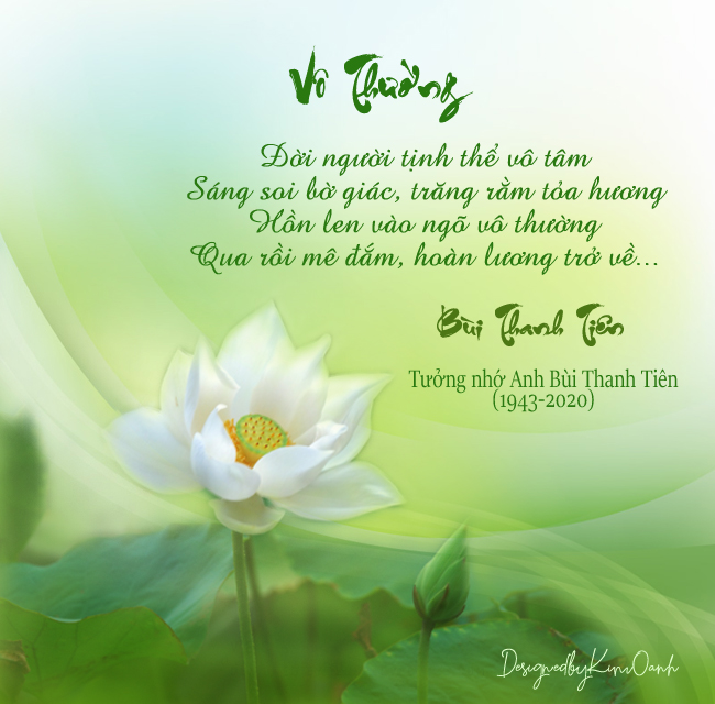 Vô Thường![]() Đời người tịnh thể vô tâm Sáng soi bờ giác, trăng rằm tỏa hương Hồn len vào ngõ vô thường Qua rồi mê đắm, hoàn lương trở về.. Bùi Thanh Tiên Không Có Em, Biển Ngừng Vỗ Sóng ![]() Ta đang mơ hương ân tình nồng ấm Bờ môi xưa chết lịm giữa cơn mê Đôi mắt em mang mầu chiều biển sẫm Trong men say, ta thấy bóng em kề.. Ai bảo kẻ không cầu sao lại được? Ta nhớ em dáng ngư nữ đang nằm Có phải em, ta tìm sưốt trăm năm Vài cánh hoa.. phủ mình em trên cát Không có em, biển nhạt nhòa hiu hắt Làn nước xanh không gợn chút nắng vàng Chiều xuống thấp, sương lam chưa kịp tới Hải đăng ơi, sao mãi đứng âm thầm!.. Không có em, biển buồn ngưng vỗ sóng Còn mong gì mây trắng với trời trong Đàn hải âu tung cánh dưới vừng đông Niềm thương nhớ đầu ghềnh ra cuối biển. Không có em, biển nghe lòng xao xuyến Cơn mưa chiều bỗng tím lạnh chơi vơi Theo triều dâng, ta ngước mặt nhìn đời Ôi huyền diệu.. của một thời yêu dấu… Bùi Thanh Tiên Hôm đi biển Rehoboth Delaware July 18, 09 Cội Nguồn mIên Viễn Ta uống nắng, tìm cội nguồn miên viễn Đồi cỏ non ghi lại dấu tình xưa Đôi cò bay về ruộng lúa cuối mùa Em khẽ nói, sao anh đi biền biệt… Dẫu đời anh vẫn vỗ về tha thiết Trên trời xanh mây trắng vẫn xây thành Ta tìm em đôi mắt huyền diễm tuyệt Hẹn tương phùng giàn bông giấy nở hoa. Em xa xôi buổi sáng sớm nhạt nhòa Theo cánh gió, chim chiều về tổ lặng Tàn đêm mộng, em mỉm cười xa vắng Ôi mênh mang giữa phố xá ngậm ngùi! Dĩ vãng nào nghe đăng đắng thương nguôi Đi bên em, ta thấy trời phố lạ Sông cuộn chảy như cuộc tình nghiệt ngã Xót đời riêng, em còn gắng quay về… Qua bao gành, bao thác suối đam mê Em cứ mãi quay cuồng trong nỗi nhớ Sông ra đi, ngàn xưa đến tận giờ Tuôn ra bể: khổ đau và sân hận… Ngày 10/3/05 (Ngày 1 tháng 2 Ất Dậu) Nguyên Hậu Bùi Thanh Tiên. Sài Gòn Ơi Ngày tháng dần qua trên đất khách Xuân lại về trong nỗi nhớ quê hương Ba mươi mấy năm rồi, viễn xứ Sàigòn ơi, trăm nhớ ngàn thương! ** Xuân đã về trên cành cây nặng tuyết Em có hay.. ngày xưa, giờ tiễn biệt Nhìn một lần cứ ngỡ đến trăm năm Xuân dẫu muộn nhưng đời đời tha thiết.. Ôi quê xưa đã cách xa biền biệt Nơi xứ người.. dù nắng tan, tuyết phủ Cách xa em vời vợi.. nửa dòng đời Quê hương dấu yêu ngày xanh ấp ủ.. Mùa Xuân nhớ.. nụ mai vàng vừa nhú Xuân đất người,hoa ngát giữa lòng ta Xứ Cờ Hoa lạnh giá, vẫn ngọc ngà Sàigòn hỡi, hẹn ngày ta trở lại… VA, đón Xuân Quí Tỵ 2013 Bùi Thanh Tiên Xuân Cửa Thiền Thời gian trôi không bao giờ quay lại Chớ tưởng rằng “Xuân bất khứ lai” Xuân của đất trời trôi đi, đi mãi Với tâm lành, Xuân vĩnh viễn ở tương lai.. Hiên chùa trăng sáng bao la Mùa Xuân của Đạo nở hoa nhiệm mầu Hương thiền hàn gắn khổ đau Ngỏ tu phúc huệ, đường vào Chân như.. Hư không hòa nhịp bể mù Sắc không, không sắc, nghìn thu phai dần Một lòng tu niệm điệu đàng Nghiệp trần đoạn dứt, đạo tràng dừng chân! Đài sen sắc tỏa trong ngần Phật tâm, Phật tánh ngày xuân trở về Giã từ sân hận u mê Tâm thanh tịnh đã, cõi về lành an.. Trải bao phiền não võ vàn Tự mình thắp đuốc soi đàng mà đi! Lời kinh “ bất khả tư nghì” Mùa xuân chánh niệm, diệu kỳ trần gian … Virginia, đón Xuân Mậu Tý 2008 Nguyên Hậu Bùi Thanh Tiên |