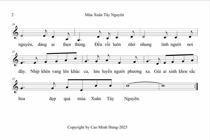 | Mùa Xuân Tây Nguyên https://www.youtube.com/watch?v=T4w4ShO4utA Nhạc và lời: Cao Minh Hưng Xuân về trên cao nguyên, mùa Xuân rộn ràng Buôn làng mừng Xuân sang, tưng bừng ca hát Kìa đàn T’rưng thanh thót vang theo tiếng cồng chiêng ngân Kìa mùa Xuân đang nở hoa khắp núi rừng Tây Nguyên Xuân về trên cao nguyên, nắng Xuân dịu dàng Trên rẫy nương đêm khuya, bập bùng lửa cháy Nhịp chày vang như khúc ca, chim én lượn xa xa Kìa dòng suối róc rách reo, đón mùa Xuân Tây Nguyên Rượu cần nồng thơm đón Xuân về với buôn làng Nụ cười đẹp xinh, gái trai làng cùng vui hát Cà phê hoa trắng khoe trên đất đỏ bazan Cồng chiêng trong tiếng ca, pơ-lang báo Xuân về Xuân về trên cao nguyên, dáng ai thẹn thùng Đến rồi luôn nhớ nhung tình người nơi đây Nhịp kèn vang lên khúc ca, lưu luyến người phương xa Gùi ai xinh khoe sắc hoa, đẹp quá mùa Xuân Tây Nguyên Cao Minh Hưng |