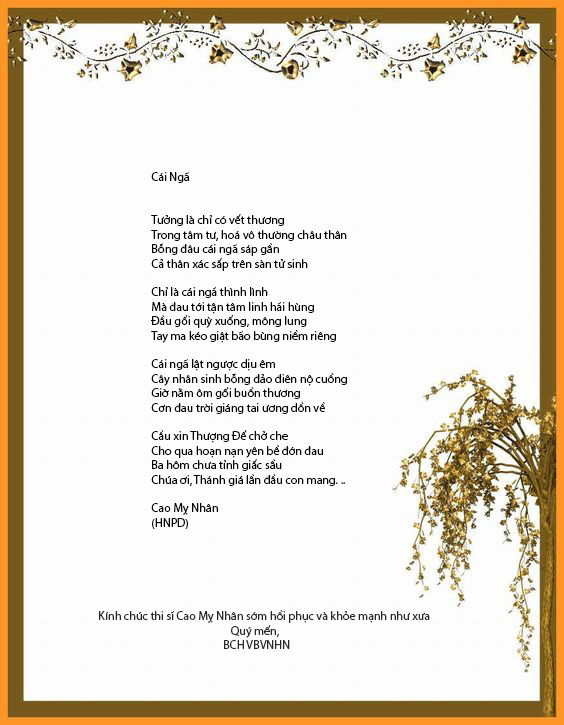 | BÀI TÌNH BUỒN Bài tình buồn vẫn đăng Thiết tha trên báo thân Diễn đàn thơ quen thuộc Có nỗi gì bâng khuâng Vì bài thơ thật buồn Nghe lòng ướt mưa tuôn Nghe tình như vời vợi Ngập hồn những nhớ thương Suốt tháng năm bên nhau Bài thơ buồn đến sau Người tình đang trước mặt Sao khổ luỵ u sầu Em vẫn hoài mộng mơ Rối mù những vần thơ Bài tình buồn thầm lặng Hoang mê tới vô bờ … Hawthorne 3 – 6 – 2022 CAO MỴ NHÂN |