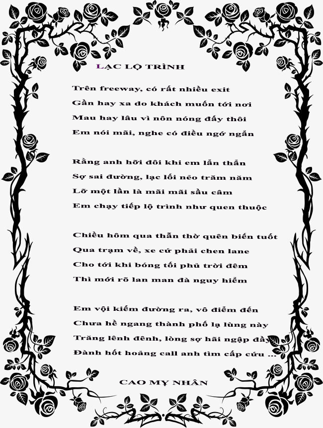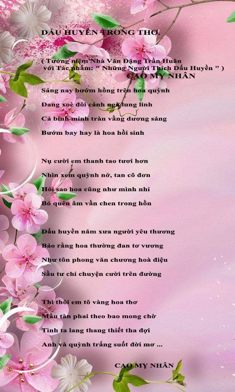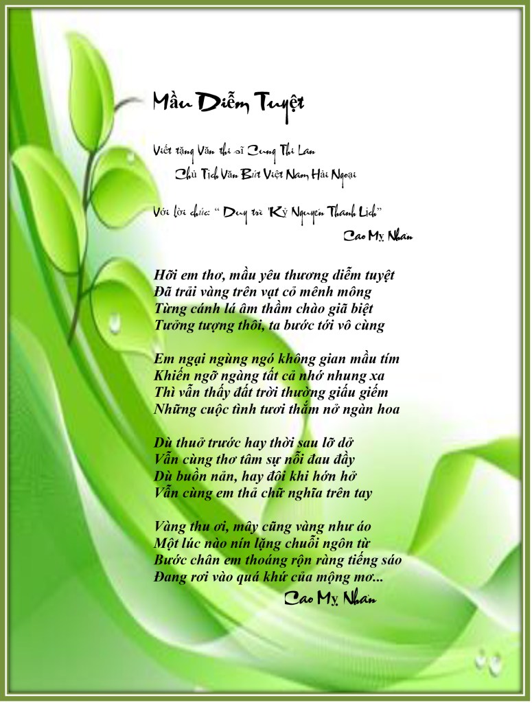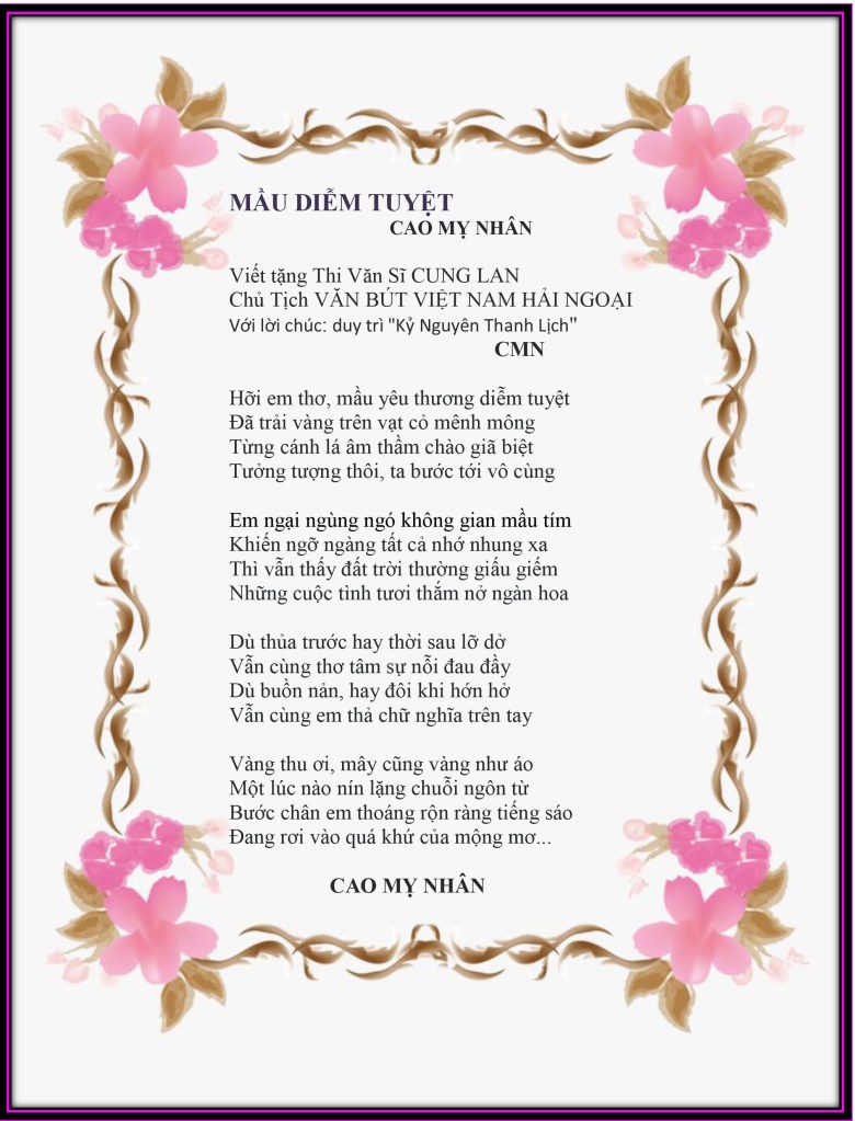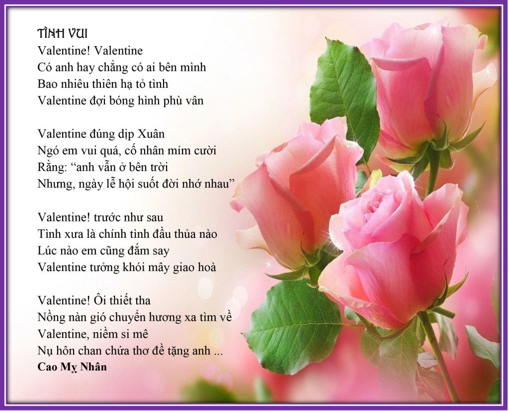 | TÌNH VUI Valentine ! Valentine Có anh hay chẳng có ai bên mình Bao nhiêu thiên hạ tỏ tình Valentine đợi bóng hình phù vân Valentine đúng dịp Xuân Ngó em vui quá, cố nhân mỉm cười Rằng : ” anh vẫn ở bên trời Nhưng, ngày lễ hội suốt đời nhớ nhau “ Valentine ! trước như sau Tình xưa là chính tình đầu thủa nào Lúc nào em cũng đắm say Valentine tưởng khói mây giao hoà Valentine ! Ôi thiết tha Nồng nàn gió chuyển hương xa tìm về Valentine, niềm si mê Nụ hôn chan chứa thơ đề tặng anh … Cao Mỵ Nhân TIẾNG YÊU Tiếng Yêu nghe thật dịu dàng Như tay anh vẫn thường quàng vai em Tiếng Yêu nghe sao êm đềm Như em che cặp mắt nhìn thơ ngây Tiếng Yêu vẳng vọng đâu đây Rõ ràng, sao lại tỉnh say giả vờ Tiếng Yêu chất ngất trong thơ Cho anh chuyên chở mộng mơ tặng người Tiếng Yêu ôi quá tuyệt vời Xin đừng lưỡng lự, kẻo rồi ăn năn Tiếng Yêu giờ đã trăm năm Ru em suốt cả giấc xuân êm đềm Tiếng Yêu em chỉ trao mình Còn chi để nói mà trình với thưa ” Biết rồi, em hết Yêu chưa Tiếng Yêu vốn mới với xưa thuận hoà …” Cao Mỵ Nhân |