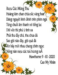 | TUỔI HẠC VÀNG THAU Cao niên tâm sự thế nào đâu Ngày trước, hôm nay, tới thủa sau Hiện tại chỉ còn làn tóc bạc Tương lai sẽ thấy lá hoa sầu Không gian khắc khoải như phai sắc Thời khắc bâng khuâng tưởng đổi mầu Ánh sáng chập chờn quanh sớm , tối Một trời bàng bạc nắng vàng thau… Hawthorne 8 – 2 – 2022 CAO MỴ NHÂN |