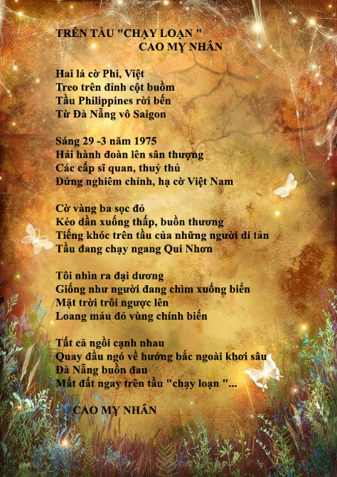 | ĐÀ NẴNG CUỐI 3/75 Vào cuối tuần tháng ba Trăng thay đổi sơn hà Có con chim gõ mõ Kêu gọi mùa nở hoa Đêm sương mù Tiên Sa Tiếng chim rơi nghẹn ngào Ôi chỉ là hồn ma Đạn bay trên biển pháo Đà Nẵng trôi bồng bềnh Thuyền bám vô lục địa Sóng trùng dương dập dềnh Lửa lan ra muôn phía Đốt cháy cả mùa xuân Núi gào lên vỡ nát Sôi bỏng cả dòng sông Lệ rơi thay tiếng hát Hai mươi chín tháng ba Lá cờ vàng cuốn lại Bốn mươi sáu năm qua Giữ nguyên sầu quan tái … CAO MỴ NHÂN |