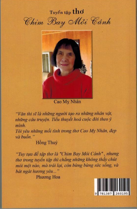 | TÁC PHẨM: 1/ HOA SAO -1959 (1000 cuốn loại Roneo) THƠ Tặng bạn Hướng Đạo dự trại họp bạn Phục Hưng, thế giới kỳ 8 , tại Trảng Bom Việt Nam. 2/ THƠ MỴ 1 – 1961 (200 cuốn loại Roneo) Nhà xuất bản Đại Nam Văn Hiến, Nhà văn Thế Phong phát hành, bán hết ngay trong 2 tuần lễ mới phát hành. Tựa : Nhà văn Thế Phong. 3/ GA XÉP – 1962- THƠ in typo Do Nhà văn Vũ Ngọc Anh (Hồ Linh ) Trách nhiệm kiểm duyệt và phát hành 4/ CHỐN BỤI HỒNG 1 – 1994 – Nhà Xuất Bản Sông Thu Hoa Kỳ – 1000 cuốn Tựa : Nhà Xuất bản Sông Thu ( Hoa Kỳ ) Nhà văn Duy Lam. ( Hoa Kỳ 5/ THƠ MỴ 2 – 1997- THƠ Xuất Bản Ngày Nay Hoa Kỳ 1000 cuốn. Tựa : Nhà Xuất Bản Ngày Nay – Nhà văn Duy Lam. Bạt : Nhà thơ Thanh Trí Cao ( Hoà Thượng Thích Quảng Thanh – Hoa Kỳ ) 6 / ÁO MẦU XANH – 1999 – THƠ Nhà Xuất Bản Cỏ Thơm – Hoa Kỳ – 500 cuốn . Tựa : Nhà Xuất Bản Cỏ Thơm ( Hoa Kỳ ) – Thi sĩ Hà Bỉnh Trung ( Hoa Kỳ ) 7/ ĐƯA NGƯỜI TÌNH ĐI TU – 2001 – THƠ Nhà Xuất Bản Tiếng Vang – Hoa Kỳ – 500 cuốn . Tựa : – Nhà Xuất Bản Tiếng Vang- Nhà văn Trần Văn. – Thi sĩ Hoàng Ngọc Liên ( Hoa Kỳ ) 8/ LÃNG ĐÃNG VÀO THU – 2001- THƠ – Nhà Xuất bản Kinh Doanh – Hoa Kỳ . 700 cuốn Tựa : Thi Sĩ Tùng Linh ( Hoa Kỳ ) Bạt : Nhà văn Hồ Linh. ( Hoa Kỳ ) 9/ SAU CUỘC CHIẾN – 2003 – THƠ Nhà Xuất Bản Cội Nguồn – Hoa Kỳ . 1000 cuốn . Tựa : Thi sĩ Diên Nghị ( Hoa Kỳ ) – Thi sĩ Song Nhị ( Hoa Kỳ ) 10/ QUÁN THƠ THÁNG NGÀY CÒN LẠI- 2009 – THƠ Nhà Xuất Bản THƯ ẤN QUÁN – Hoa Kỳ – 800 cuốn. Tựa : Thi sĩ Hà Thượng Nhân ( Hoa Kỳ ) Bạt : Thi sĩ Trần Hoài Thư ( Hoa Kỳ ) 11 / NHỊP TIM THƠ – 2016. Nhà Xuất Bản Nhân Ảnh Hoa Kỳ . Phát hành : Amazon. Tựa : – Thi sĩ Luân Hoán ( Canada ) – Thi sĩ Võ Thạnh Văn ( Hoa Kỳ ) Bạt : Tiến sĩ Bùi Lê Dzung ( Australia ) 12 / TÌNH MUỘN – Thơ – 2018. Nhà Xuất Bản Nhân Ảnh Hoa Kỳ . Phát hành : Amazon. Tựa : Thi sĩ Luân Hoán (Canada) 13/ THƠ XƯỚNG HOẠ CAO MỴ NHÂN & TRỊNH CƠ Thơ – 2020. Nhà Xuất Bản Nhân Ảnh – Hoa Kỳ. Phát hành: Amazon. Tựa : Thi sĩ Lê Hân( Hoa Kỳ ) Nhà văn Nguyễn Thành( Việt Nam ) |