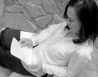 8. Âm thầm chịu đựng bản tính của đa số phụ nữ có chồng nơi chiến trận. Thiếu nữ đọc thơ ngay tại bậc tam cấp thể hiện nỗi khao khát mong chờ và nôn nóng muốn biết tin chồng. Tuy xa chồng, người phụ nữ này vẫn trong y phục gọn gàng tươm tất. Giải thích tấm hình này, chị Vũ Phan Anh kể chuyện về người bạn gái của chị đi đến tiệm làm tóc. Người thợ làm tóc hỏi có phải chị làm đẹp để ăn cưới không thì chị này trả lời rằng chị muốn làm đẹp để đón chồng về phép thôi.