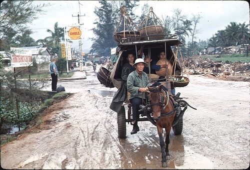 Đến chiều, tôi bán bưởi ở trước tiệm sách Nguyễn Lê cho đến sẫm tối. Phương tiện giúp tôi chuyển những đống bưởi là những chiếc xe ba gác mà má tôi thuê chuyển những rổ cam quýt của má.