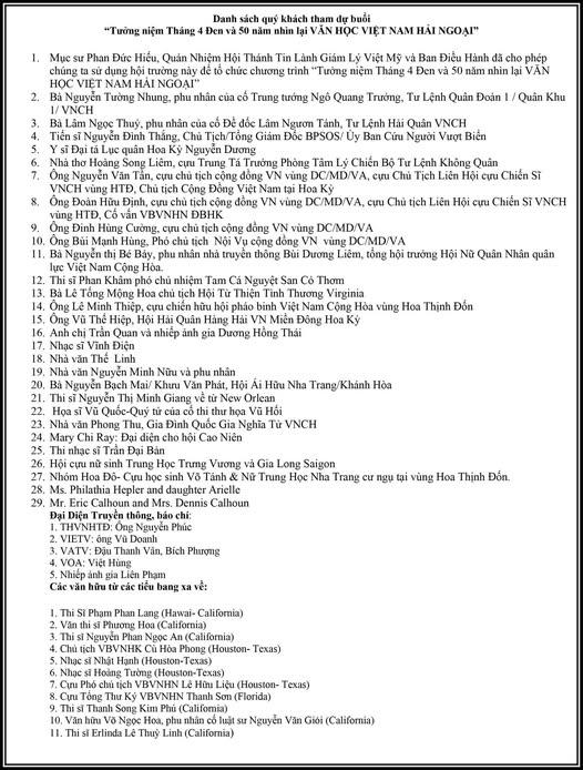 | Chủ tịch Cung Thị Lan Tường trình buổi Lễ Tưởng Niệm 30 tháng 4 Đen và 50 năm nhìn lại VĂN HỌC VIỆT NAM HẢI NGOẠI vào ngày 12 tháng 4 năm 2025- Maryland, ngày18 tháng 4 năm 2025 Kính thăm quý văn hữu VBVNHN, Cung Lan xin đại diện Ban Chấp hành và ban tổ chức VBVNHN tường trình buổi Lễ Tưởng niệm Tháng 4 Đen và 50 năm nhìn lại VĂN HỌC VIỆT NAM HẢI NGOẠI ngày 12 tháng 4 năm 2025: Như kế hoạch trong nhiệm kỳ 2024-2026, BCH VBVNHN thực hiện buổi Lễ Tưởng niệm Tháng 4 Đen và 50 năm nhìn lại VĂN HỌC VIỆT NAM HẢI NGOẠI Nhờ sự giúp đỡ của nhà văn/nhà báo Đào Hiếu Thảo, chúng tôi đã liên lạc với mục sư Phan Đức Hiếu để được phép sử dụng hội trường. Chúng tôi đã thiết kế các banners, làm fliers, vé vào cửa, giấy mời, làm sơ đồ các bàn ăn, liên lạc nhà hàng đặt thức ăn, gửi thông báo đến hội viên và giấy mời các hội đoàn và truyền thông trong vùng Hoa Thịnh Đốn. Chiều ngày thứ Sáu 11/4/2025 Ban tổ chức và Ban chấp hành đã có mặt để sắp xếp các bàn ăn và trang hoàng sân khấu. Anh Hoàng Phi Long theo sơ đồ do Cung Lan gửi, sắp xếp đúng theo vị trí. Bàn chữ nhật gồm 8 ghế, bàn tròn có 10 ghế. Ngoài ra chúng tôi còn có bàn Tiếp Tân và bàn của Ban Tổ Chức dành cho khách và hội viên ngồi chờ một cách thư giãn cho đến khi đ ư ợc hướng dẫn vào chỗ ngồi. Đến 6 giờ 30 chúng tôi đã hoàn thành chuyện sắp xếp và trang hoàng. Nhờ sự giúp đỡ của VH Tạ Quang Tuấn và phu nhân Thanh ghé mua thức ăn trước khi đến nhà thờ, chúng tôi có thức ăn nhẹ: Bánh mì và nước suối. Tân phụ trách thức ăn buổi tiệc nói chúng tôi, Ban tổ chức và Ban chấp hành, phải lo chuyện bưng thức ăn cho khách. Tôi rụng rời, căng thẳng vì trong tiệc của hội Cao Niên tôi thấy một số em tiếp tân cứ ngỡ là của nhà hàng, chứ đâu biết là thành viên, thân hữu của các vị trong hội cao niên. May mắn là sau đó Hoàng Hậu, vợ Tân đến cho chúng tôi biết là gia đình cô sẽ lo chuyện này. Với cảm giác nhẹ nhõm, chúng tôi về nhà. Vì khá lo việc kẹt xe và đến trễ sẽ thất lễ với khách và hội viên, nên trên đường về, tôi báo các VH từ các bang xa đến ở nhà tôi: “Nên rời nhà lúc 8 giờ sáng để không bị trễ trong trường hợp không dự đoán trước như bị kẹt xe, hay đường bị chặn không được cho vào trong khu vực thủ đô Hoa Thịnh Đốn vì lý do nào đó.” Hoàng Hậu đề nghị tôi in bảng thực đơn để cô đem giá đặt trên mỗi bàn, nhưng khi tôi gọi anh Đào Hiếu Thảo nhờ giúp, được biết không thể in menu trong giây phút gấp rút nên tôi hứa sẽ viết tay các bảng thực đơn cho 17 bàn ăn. Viết xong các bảng thực đơn gần1 giờ đêm mới lục đục dọn các thứ vì sợ bị quên. Trằn trọc không ngủ được, 4 giờ sáng tôi dậy đã thấy phó chủ tịch Erlinda Thuỳ Linh dậy từ lúc nào. Kế đến VH Thanh Song Kim Phú và VH Võ Ngọc Hoa cũng dậy và chuẩn bị. Chúng tôi ăn sáng lúc 7 giờ. Chuyện trò một lúc rồi lên đường lúc 7 giờ. Sáng Ngày 12 tháng 4 năm 2025 8 giờ 28 phút chúng tôi đã đến Hội Thánh Tin Lành Giám Lý Việt Mỹ và đậu xe ngay chỗ tốt nhất trong bãi đậu. Mục sư Hiếu cũng đến sớm để mở cửa cho chúng tôi vào. Dọn dẹp áo khoác và giỏ xách xong, chúng tôi trải thêm bàn ăn, trang hoàng các bàn tiếp tân và bàn dành cho ban tổ chức, xếp bảng thực đơn và cắm hoa. Quý hội viên trong ban tổ chức (nhạc sĩ Hoàng Tường, thi sĩ Tạ Quang Tuấn) cũng đến sớm. Chúng tôi tâm tình một lúc rồi chụp hình. 10 giờ 30 đã có nhiều văn hữu hội viên, thân hữu và khách đến. Phụ trách âm thanh và thành viên trong ban văn nghệ cũng đã có mặt. Chúng tôi chụp hình, phỏng vấn và chuẩn bị mọi thứ sẵn sàng và chu đáo cho buổi lễ. ***Đúng 11:15 chúng tôi đã bắt đầu chương trình theo đúng kế hoạch. Chỉ có một chút thay đổi nhỏ về sự tuần tự để tạo sự hợp lý trong việc phối trí thời gian. 11:15A.M: Bắt đầu chương trình đúng giờ- MC nhà văn /nhà báo Đào Hiếu Thảo và MC Helen Thanh Hương Từ: Chào mừng Tuyên bố lý do 11:30 A.M: Chào cờ: 1. Quốc ca Hoa Kỳ– 2. Quốc ca Việt Nam Cộng Hòa 3. Mặc niệm- Người Là Ai-Nhạc của Hoàng Tường 4. Lá Cờ Thiêng- Nhạc của Hoàng Tường 5. Giới thiệu chiếc ghế trống: MC Thanh Hương 12:00P.M: Giới thiệu quý khách tham gia– 12:10 MC đọc danh sách Mạnh Thường Quân 12:20 P.M Phát biểu của Chủ tịch VBVNHN Cung Thị Lan 12:30 P.M Phát biểu của Phó chủ tịch Đăng Nguyên Phát biểu 12:30 P.M: Giới thiệu tác giả và tác phẩm VBVNHN- VH Ta Quang Tuấn và VH Y Thy Võ Phú phụ trách 13:00 P.M: Hợp ca Văn Bút Ca và Vinh Danh VBVNHN do tất cả hội viên VBVNHN trình bày 13:15 P.M: Video của đạo diễn Chu Lynh THÔNG ĐIỆP 50 – A MESSAGE FOR 50 YEARS (9 phút) 13:30 P.M: Mời quý khách dùng thức ăn trong lúc chuẩn bị Văn Nghệ Phần A: Nhạc chủ đề: Tưởng niệm Tháng 4 Đen Tháng Tư Nhớ Mẹ – Trần Đại Bản Sài Gòn Vĩnh Biệt – Thanh Sơn 3. Em Còn Nhớ Mùa Xuân – Thuỳ Linh 4. 1. Nỗi Lòng Mẹ Tháng Tư – Thơ Phạ