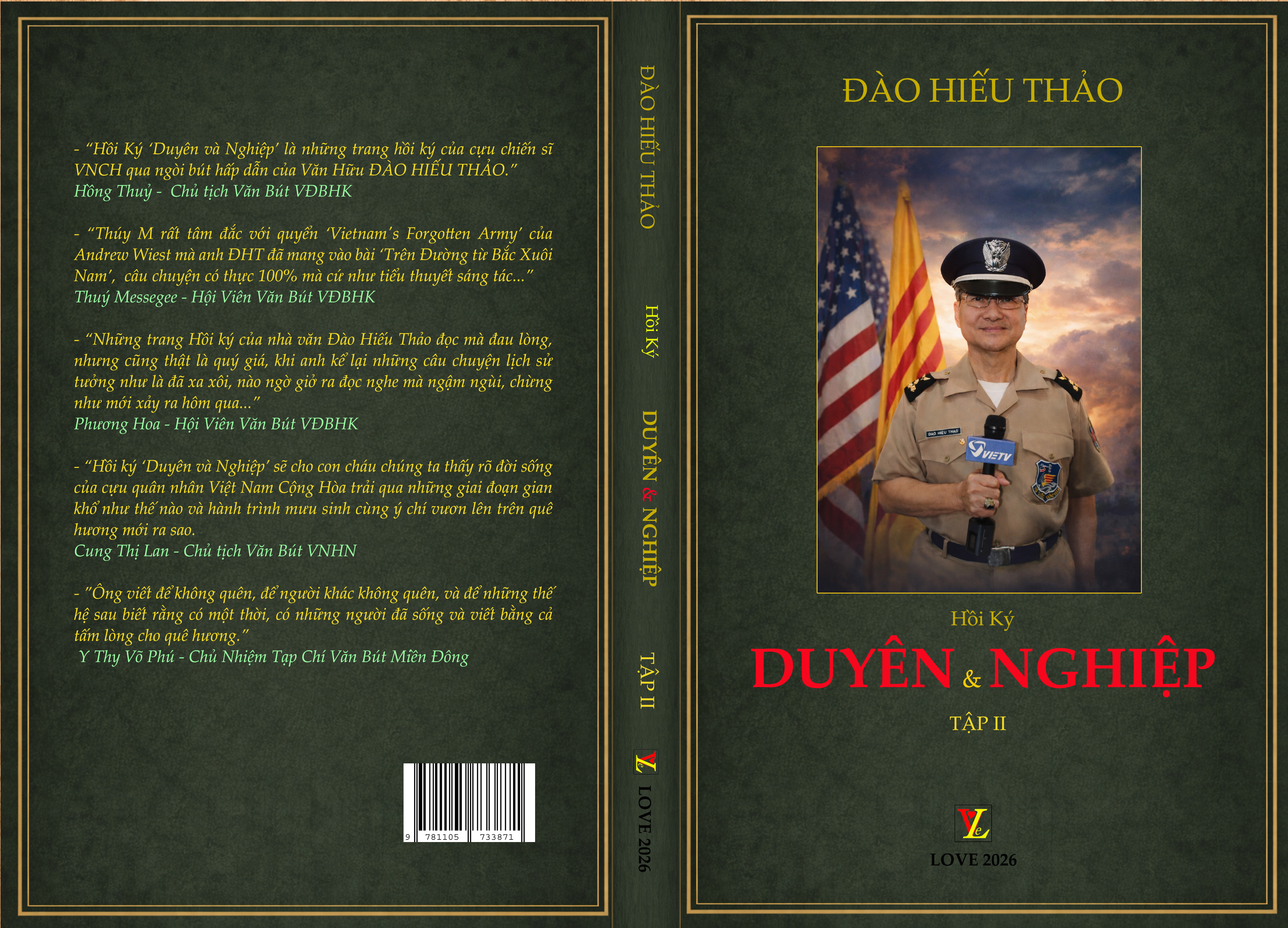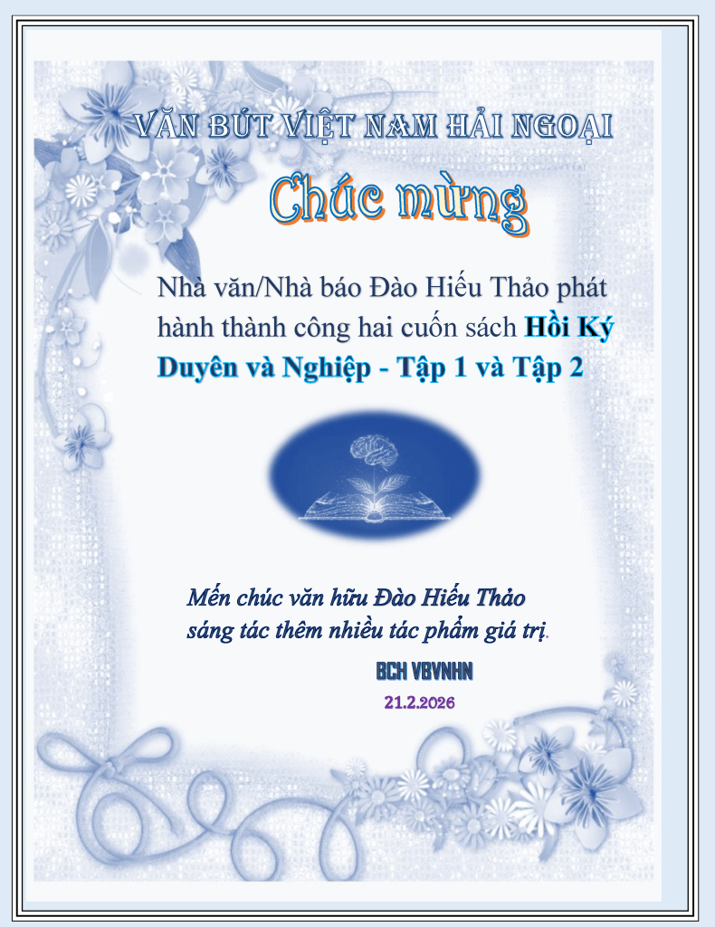 | Maryland ngày 21/2/2026 Kính thăm quý văn hữu VBVNHN, Cung Lan kính mời quý văn hữu góp lời chúc mừng Nhà văn/Nhà báo Đào Hiếu Thảo vừa phát hành hai cuốn sách Hồi Ký Duyên và Nghiệp – Tập 1 và Tập 2 ![]() Ðể có một bản copy, xin quý vị liên lạc với văn hữu Ðào Hiếu Thảo qua email daohthao@yahoọcom, hoặc đường link sau đây https://www.lulu.com/shop/thao-dao/duy%C3%AAn-v%C3%A0-nghi%E1%BB%87p-quy%E1%BB%83n-i/paperback/product-84wg9jw.html?page=1&pageSize=4 Quý văn hữu có thể tìm hiểu thân thế và bề dày cống hiến cho cộng đồng Việt Nam Hải Ngoại của văn hữu Đào Hiếu Thảo trong trang tác giả sau https://vietpen.org/dao-hieu-thao/ Xin chân thành cảm ơn quý văn hữu dành thời giờ cho các sinh hoạt của Văn Bút. Chân thành cảm ơn Văn thi sĩ Y Thy Võ Phú hết lòng giúp đỡ bạn văn và chia sẻ thông tin này https://vietpen.org/home-2/ Kính chúc quý văn hữu luôn vui mạnh. Quý mến, Cung Thị Lan |
