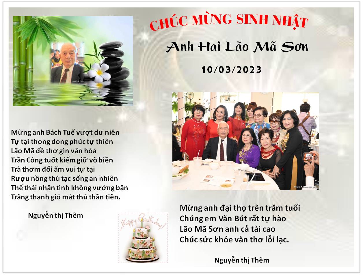 | MỪNG SINH NHẬT anh Trần Công ********* Sinh Nhật anh Hai qua bách niên Cầu mong huynh trưởng luôn bình yên Dôi dào sức khỏe tâm an lạc Con ngoan cháu thảo thật thần tiên Đại thọ mừng anh lắm bạn hiền Bạn thơ, vi hữu cứ liên miên Gia đinh , em cháu đều thương mến Chúc anh trường thọ, phước vô biên VA ngày 10/3/2023 Ngọc Hạnh |