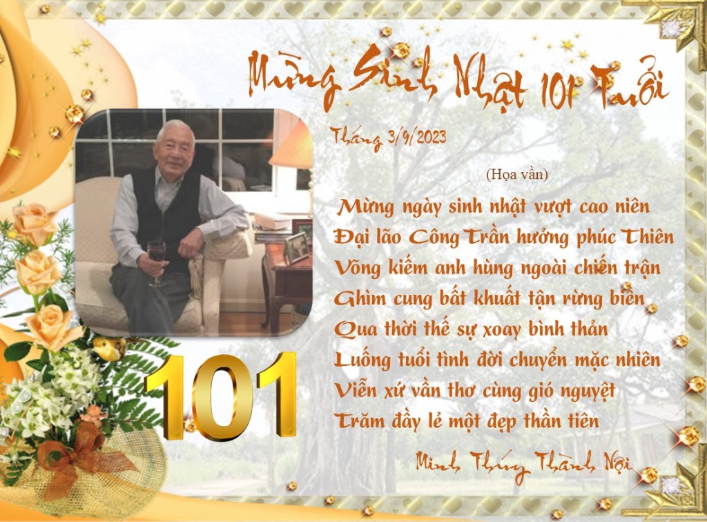 | Một trăm năm cũ đã qua rồi Một trăm năm mới bắt đầu thôi Vạn sự khởi đầu nan bất thối Một trăm năm trước cũng vậy thôi Kính Chúc anh Hai, bác Trần Công, thi sĩ Lão Mã Sơn, văn hữu tiền bối bước sang bách niên mới sẽ tạo nhiều thành công mới, kỷ lục mới. Em út, cháu Dương Vũ, CA sĩ Vương Vũ, văn hữu tiểu bối kính chúc Sinh Nhật anh Hai Một Trăm lẻ Một tuổi hoành tráng, vui tươi và đầm ấm bên người thân. Kính mến, Dương Vũ, |