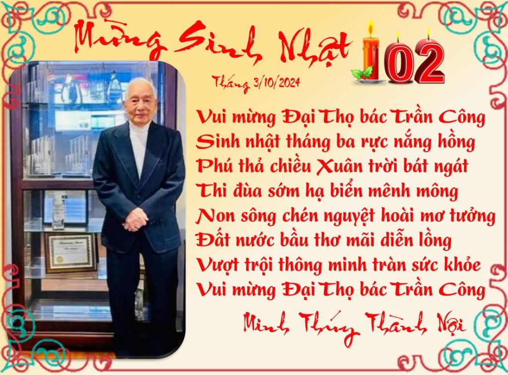 | Thân mến kính chúc mừng SINH NHẬT 102 TUỔI CỦA LÃO HUYNH TRẦN CÔNG_ LÃO MÃ SƠN! CHÚC MỪNG SINH NHẬT ANH HAI_3102024! Chúc mừng sinh nhật anh Hai, Hơn Trăm tuổi chẵn vẫn còn phương phi. Tinh thần sáng suốt vô ngần, Thơ văn thi phú xa gần ngợi khen. Bạn bè ai nấy kính thương, Ước gì theo dấu thọ trường giống anh! Lê Mộng Hoàng |