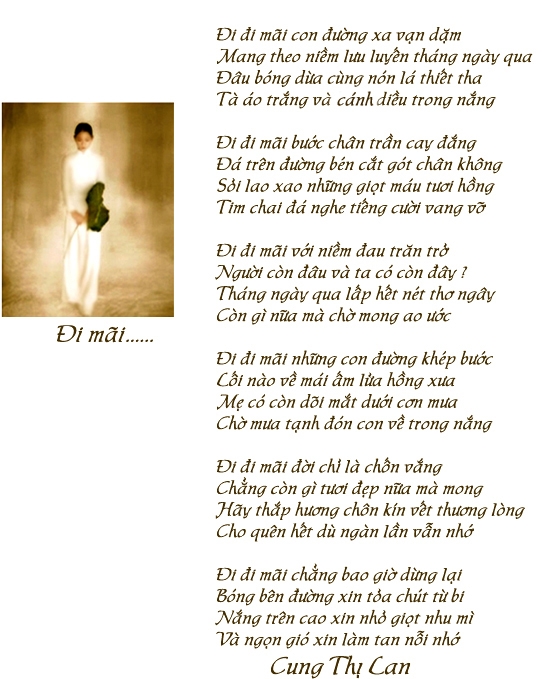 | Đi Mãi Đi đi mãi con đường xa vạn dặm Mang theo niềm lưu luyến tháng ngày qua Đâu bóng dừa cùng nón lá thiết tha? Tà áo trắng và cánh diều trong nắng Đi đi mãi bước chân trần cay đắng Đá trên đường bén cắt gót chân không Sỏi lao xao những giọt máu tươi hồng Tim chai đá nghe tiếng cười vang vỡ Đi đi mãi với niềm đau trăn trở Người còn đâu và ta có còn đây? Tháng ngày qua lấp hết nét thơ ngây Còn chi nữa mà chờ mong ao ước? Đi đi mãi những con đường khép bước Lối nào về mái ấm lửa hồng xưa? Mẹ có còn dõi mắt dưới cơn mưa Chờ mây tạnh đón con về trong nắng? Đi đi mãi đời chỉ là chốn vắng Chẳng còn gì tươi đẹp nữa mà mong Hãy thắp hương chôn kín vết thương lòng Hãy quên hết dù ngàn lần vẫn nhớ Đi đi mãi chẳng bao giờ dừng lại Bóng bên đường xin tỏa chút từ bi Nắng trên cao xin nhỏ giọt nhu mì Và ngọn gió xin làm tan nỗi nhớ Cung Thị Lan |
