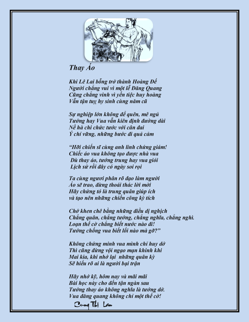 | Chán Đời Ngẫm đi nghĩ lại thấy chán đời Thế gian thiên hạ chẳng còn vui Tranh nhau hai chữ khôn và dại Bêu xấu nhau hoài chẳng thấy lui Mua danh ba vạn bán ba hào Người nỡ lòng nào làm vậy sao? Mất rồi? Hay vẫn là đồng loại? Ích thú gì tranh chữ thấp cao? Bầu bí kia còn biết thương nhau Tàu ngựa bỏ ăn khi con đau Tôi anh có phải người chung nước? Có phải anh em, chung máu đào? Lời nói cũng cần lựa thanh cao Sao anh cứ mãi mày với tao? Nếu anh chẳng muốn nghe gắt gỏng Lẽ nào anh dụng trò bán rao? Cứ nghĩ tôi là kẻ ngu đi Còn anh xuất chúng chẳng ai bì Khôn khôn dại dại vô cùng tận Một phút buông tay còn được gì? Cung Thi Lan |