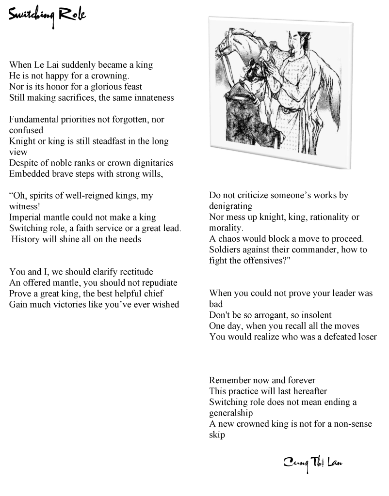 Tưởng Nhớ Trưng Vương![]() Trưng Vương hai vị nữ anh hùng Phất cờ khởi nghĩa chống giặc Trung Thù nhà, nợ nước quyết tâm trả Oai phong voi, ngựa tiến trùng trùng Đuổi quân Đông Hán lên Vương nữ Mê Linh dựng lại nghiệp vua Hùng Ba năm Âu Lạc trời một cõi Rèn chí quyết tâm giữ đến cùng Chỉ tiếc sức người trong giới hạn Quần thoa không đấu lại gian hùng Bất phục bạo tàn trầm sông Hát Nghìn đời rạng sử tấm lòng trung Cung Thị Lan |