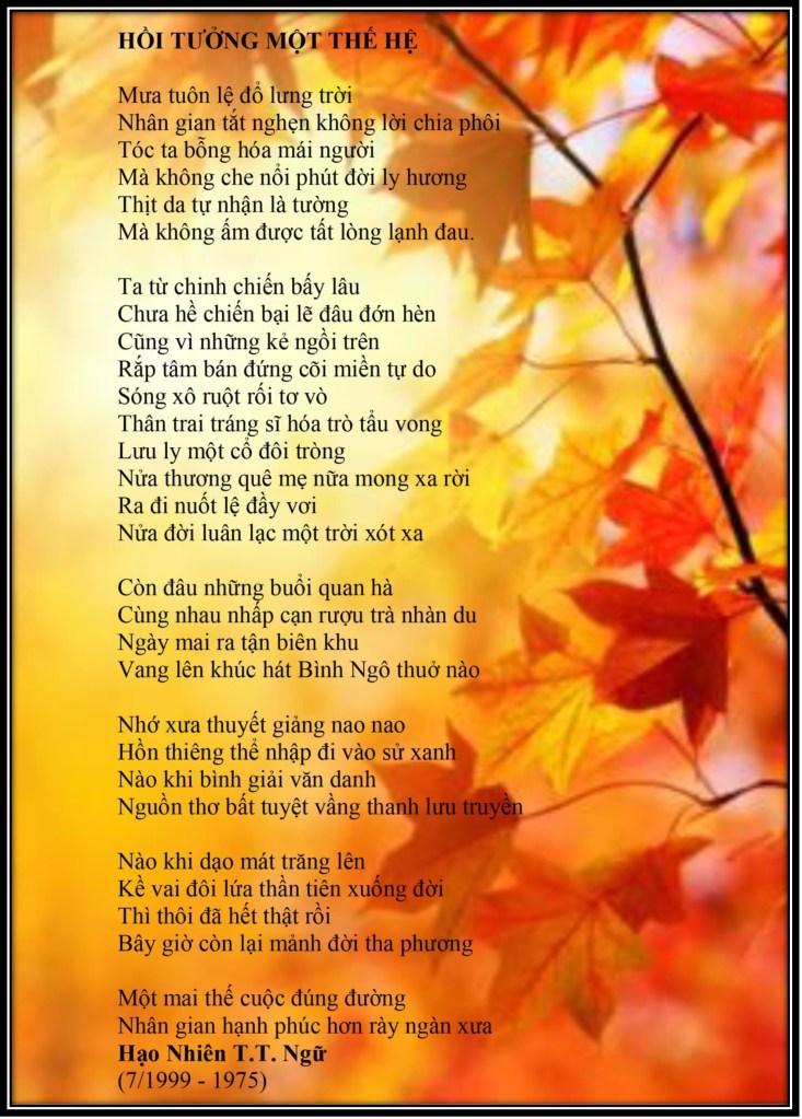 | VẬN NƯỚC TRAI THỜI LY LOẠN Phải Chịu Cảnh Biệt Ly QUỐC HẬN LƯU VONG 30-4-1975 Hùng Sử Thi Hiện Đại Hạo Nhiên TTNg Lên tầu Long Hồ ngày 29-4-1975 bến Bạch Đằng Saigon-ra khơi 9pm bến kho 5 Khánh Hội …Mưa đêm … HỒI TƯỞNG MỘT THẾ HỆ (Lưu Vong Hận) Mưa tuôn lệ đổ lưng Trời! Nhân gian uất nghẹn không lời chia ly Tóc ta bỗng hoá mái người Mà không che nổi phút đời ly hương Thịt da tự nhận là tường Cũng không ấm được tấc lòng lạnh đau Ta từ chính chiến bấy lâu Chưa hề chiến bại lẽ đâu đớn hèn Cũng vì cái bọn đồng minh * Đang tâm bán đứng cõi miền Tự Do Sóng xô ruột rối vò tơ Thân trai tráng sĩ hoá trò tẩu vong Lưu ly một cổ đôi tròng Nửa thương quê Mẹ nửa mong xa rời Ra đi nuốt lệ đầy vơi Một đời luân lạc một Trời xót xa Còn đâu những buổi quan hà! Cùng nhau nhấp chén rượu trà nhàn du Ngày mai ra tận biên khu Vang lên khúc hát Bình Ngô thưở nào ***Nhớ xưa thuyết giảng nao nao Hồn thiêng sông núi đi vào sử xanh Nào khi bình giải Văn Danh Nguồn thơ bất tuyệt vần thanh lưu truyền Nào khi dạo mát trăng lên Kề vai đôi lứa thần tiên xuống đời Thì thôi đã hết thật rồi Bây giờ còn lại mảnh đời tha phương Một mai thế sự đổi thay Nhân gian hạnh phúc hơn rày ngàn xưa Hôm nay sóng dậy dầm mưa Tàu Cộng tan tác dựng cờ phục hưng **(2016) LittleSaigon Việt Hải Ngoại Chúc Tam An Vui Hoà Bình (7-1999-1975) * Hoa Kỳ đổi chiến lược trao đổi Tầu Cộng và VNCH !?(1960-1975 ?!) **Hiện nay 2016 Hoa Kỳ đổi chính lược đánh sập Tầu Cộng và Việt Nam có cơ hội phục quốc… ***Bình giải Việt Văn và Sử Học cho học trò lớp 9-10 trung học VNCH 1965–1966-1967… |