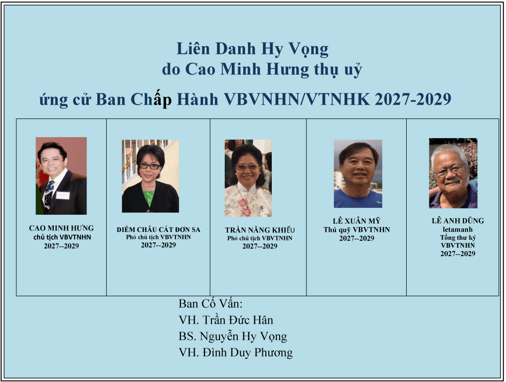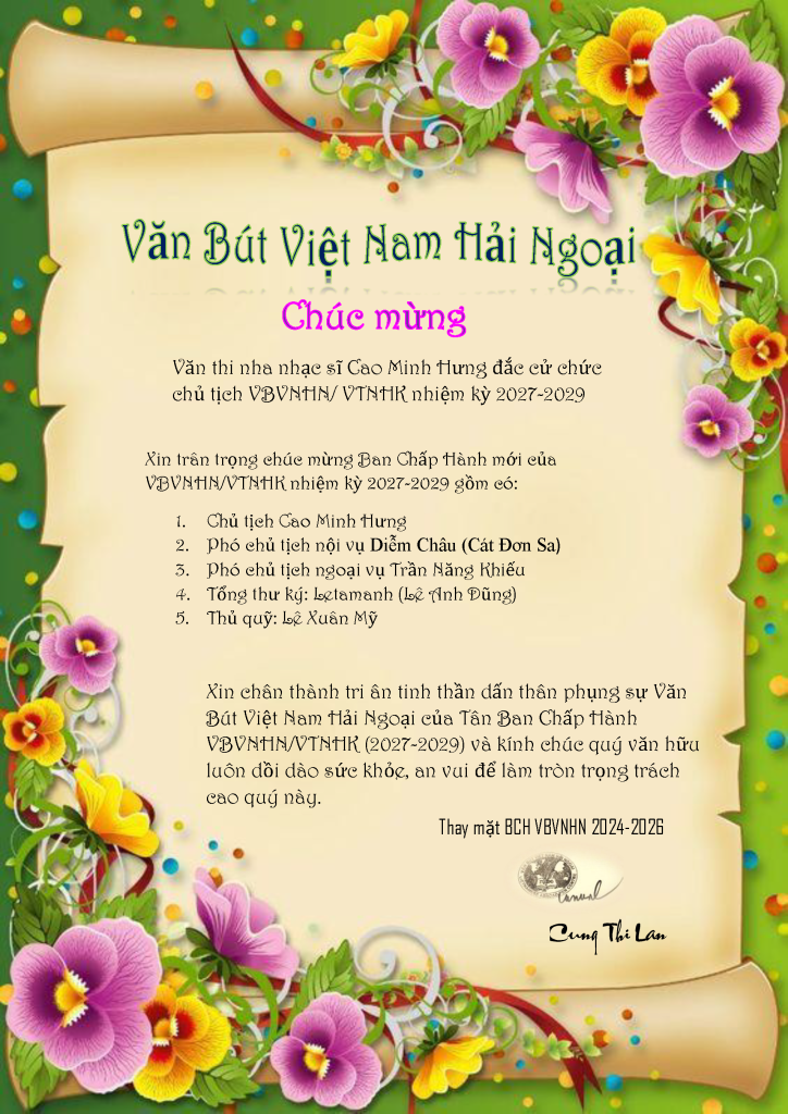 | Maryland, ngày 20.02.2026 Kính thăm quý văn hữu VBVNHN, Cung Lan kính mời quý văn hữu góp lời chúc mừng Tân chủ tịch VBVNHN/VTNHK Cao Minh Hưng cùng Ban chấp hành VBVNHN/VTNHK đã đắc cử Ban Chấp Hành VBVNHN/ VTNHK nhiệm kỳ 2027-2029. CungLan xin đại diện BCH VBVNHN Trung Ương xin tri ân quý văn hữu trong Ban Chấp Hành VBVNHN/VTNHK nhiệm kỳ 2027-2029 đã cố gắng dành thời giờ hiếm quý để góp sức trong Ban chấp hành VBVTNHK và cùng VBVNHN Trung Ương giữ vững vai trò của VBVNHN trên văn đàn Văn Bút Quốc Tế. Xin chân thành tri ân quý văn hữu: Chủ tịch Cao Minh Hưng Phó chủ tịch nội vụ Diễm Châu (Cát Đơn Sa) Phó chủ tịch ngoại vụ Trần Năng Khiếu Tổng thư ký: Letamanh (Lê Anh Dũng) Thủ quỹ: Lê Xuân Mỹ Xin chân thành cảm ơn chủ tịch VBVNHN/VTNHK Đình Duy Phương đã hết lòng giúp đỡ Tân Ban chấp hành hoàn tất liên danh ứng cử cho nhiệm kỳ tới Xin đặc biệt tri ân Tân chủ tịch Cao Minh Hưng vì thiện ý mà gắng sức giúp Văn Bút vùng Tây Nam Hoa Kỳ. Cung Lan tin Văn Bút vùng Tây Nam Hoa Kỳ sẽ phát triển mạnh mẽ hơn nữa trong tương lai. Xin kính chúc sức khỏe quý văn hữu với tấm lòng quý mến, Cung Thị Lan |