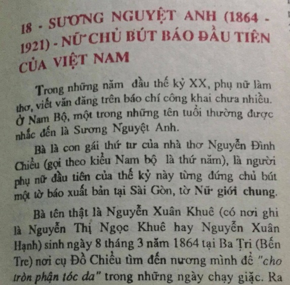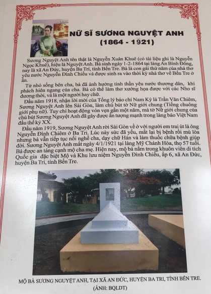 Nữ sĩ Sương Nguyệt Anh, tên thật là Nguyễn Thị Ngọc Khuê (Nguyễn Thị Khuê, Nguyễn Xuân Khuê, Nguyễn thị Ngọc Khuê hay Nguyễn Xuân Hạnh) sinh ngày 21 tháng 4 năm 1864 tại Ba Tri, Bến Tre.