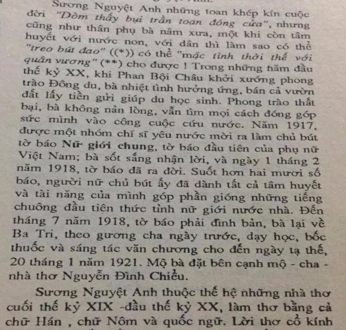 Hôm nay, ngày 20 tháng 01 năm 2021, nhân kỷ niệm 100 năm ngày giỗ của nữ thi sĩ, đồng thời là nữ nhà báo đầu tiên của Việt Nam Sương Nguyệt Anh, tôi xin thắp nén hương lòng gửi đến người quá cố, đồng thời xin ôn lại tiểu sử của bà với niềm kính trọng và khâm phục vô biên.
