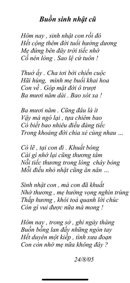 | MẸ ƠI VĨNH BIỆT! Mẹ ơi! con về không kịp Giấc dài mẹ đã hôn mê Đôi mắt thân yêu đã khép Mẹ đâu hay biết con về! Con đi đầu non, cuối bể Mấy mươi năm, mẹ vẫn chờ Giờ sao lạnh lùng quá thể Gọi hoài, mẹ vẫn trơ trơ! Mẹ ơi! Lòng đau như cắt Chuyến phà đêm chở xác về Có một tinh cầu vừa tắt Lạnh lùng sông chảy dòng khuya… Sáng nay, người ta khâm liệm Áo quan đóng nắp lại rồi! Từ đây muôn đời, vĩnh viễn Đâu còn thấy nữa, Mẹ ơi! Thân xác vùi trong lòng đất Mẹ nằm giữa một đồi hoa Mẹ ơi! Mộ vừa mới lấp Từ đây đất lạnh là nhà! Từ đây tuyệt vô hy vọng Quê hương mất dấu thiên đường Mẹ mang theo niềm vui sống Lấp cùng dưới đáy mồ chôn! Mẹ ơi! Xác thân yêu dấu Vùi trong đất lạnh đời đời Hồn con không nơi nương náu Biết tìm đâu nữa, Mẹ ơi! Lặng nhìn bàn thờ nghi ngút Di ảnh mờ trong khói hương Thấm nỗi đau buồn tang tóc Còn gì mà tiếc, mà thương! Mẹ ơi! Tử sinh chia biệt Một lần cho đến thiên thu Nghĩa là muôn đời, muôn kiếp Hết mong gặp Mẹ nhân từ! 9/10/11 Lãm Thuý |