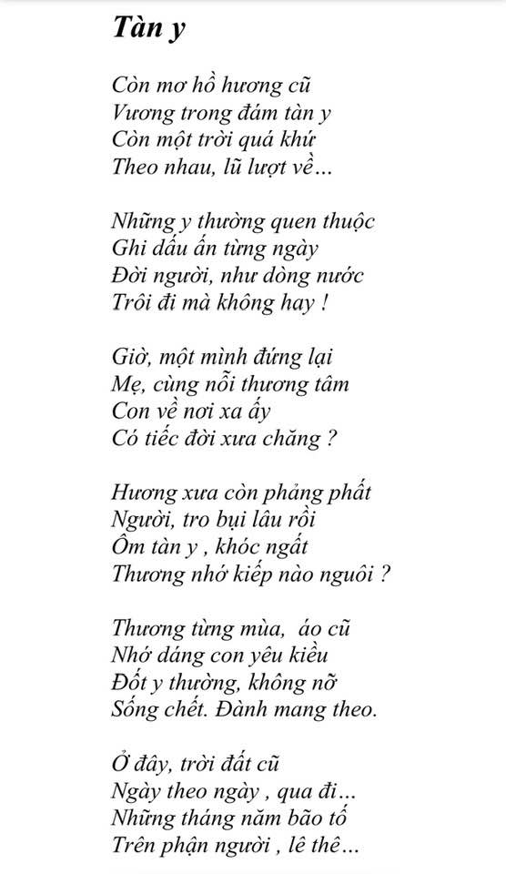 | Còn Thương Lá Biếc Thèm nghe người nói một lần Những yêu thương cũ của phần đời xưa Hình như cho đến bây giờ Có gì u uẩn, người chưa tỏ bày Thì thôi hãy ngồi xuống đây Nói đi cho cạn những ngày khổ đau Em đây: hương nhạt, hồn sầu Có gì đáng bận lòng nhau cả đời ! Dẫu là người nói cho vui Lời không thật. Cũng tạ người. Thâm ân Cho em một chút ân cần Chút vui trễ muộn. Chút tần ngần khuya Chút gì như núi sông chia Như hoa tàn rụng, lá lìa cành thu Chút gì, tịch mịch hoang vu Mà lay động cả hồn mù mịt xưa Nghe chừng thuở ấy chưa qua Sắc hoa tím cũ trên tà áo thơ Tóc dài buông mượt lầu hoa Đường không vạn dặm mà ra nghìn trùng Chiều ai thả khói mông lung Chiều ta mòn mỏi ngóng từng bóng qua Mấy con đường, có bao xa Mà nghe cả một Ngân Hà cách chia! Thôi thì người hãy nói đi Ba mươi năm ấy, giữ gì trong tim? Vì đâu chẳng thể nguôi quên Vì đâu ôm mãi niềm hoài vọng câm Một đi là đã trăm năm Ái ân chi cũng một lần đó thôi! Giữ cho nguyên nỗi ngậm ngùi Càng thêm chua xót cho người long đong Tiếc thay! khi hiểu được lòng Là hoa kia đã theo dòng nước trôi Ba mươi năm đã qua rồi Biết bao đất lở, sông bồi. Tang thương Biển xưa dâu đã đầy nương Giấc tan Hồ Điệp, còn vương mộng vàng Đã bao năm tháng thu tàn Còn thương lá biếc những hàng cây xưa Thương người đao phủ ngây thơ Nhát dao vô ý, đâu ngờ mạng chung Chuyện xưa nhắc lại mủi lòng Giá như tro cũ ta đừng bới lên Dẫu gì nắng cũng qua hiên Dẫu gì đời cũng đôi miền trần ai Thì đi cho hết kiếp này Mặc cho hệ lụy đã đầy vai mang Một lời như thể giải oan Không thôi sầu tủi chắc ngàn đời vương Nhưng sao dường ngậm ngùi hơn Phải chi không biết, chắc còn bình an Bây giờ khói cũ mang mang Bũa ta ngọn sóng của tràng giang xưa Chuyện lòng nhắc nhở thuở ngây thơ Ngó nhau đầu bạc, buồn ngơ ngẩn buồn Lãm Thuý |