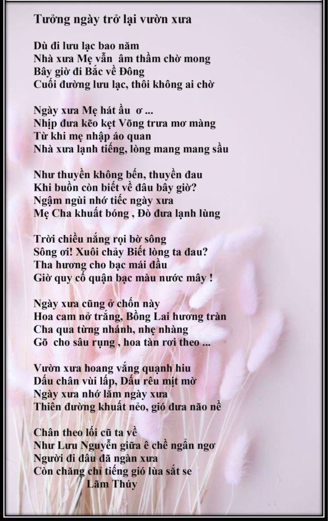 | NỖI NHỚ KHÔN NGUÔI Nhớ hoài nắng rọi bờ sông Thuyền ai xuôi mái theo dòng nhẹ trôi Sông xưa bên lở, bên bồi Trăng xưa khuyết tịch thuở người xa nhau Nhớ hoài hoa bưởi, hoa cau Hoa cam trắng nở chiều nào vườn xưa Giữ mùi hương cũ trong Thơ Nhớ cha gõ cánh hoa mờ mịt bay Nhớ em Thơ dại một bầy Đói no ấm lạnh những ngày còn chung Ta như chim bỏ xa rừng Bay nơi viễn xứ mịt mùng gió sương Bây giờ tang tóc, thê lương Con ra tro bụi sầu vương trăng ngàn Em ta yên nghỉ mộ phần Mẹ cha khuất núi phù vân kiếp người Ta thân lữ khách bên trời Ngùi trông cố quận xa khơi ,mịt mù Nghe sầu trĩu nặng tâm tư Nghe bao hoài niệm về như lũ tràn Nén lòng sao lệ khôn ngăn Trái tim tan chảy theo ngàn nỗi đau LÃM THÚY |