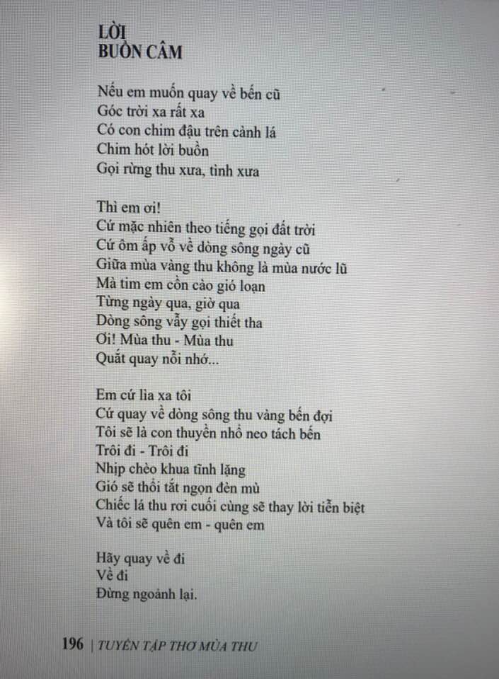 | LỜI BUỒN CÂM Nếu em muốn quay về bến cũ Góc trời xa rất xa Có con chim đậu trên cành lá Chim hót lời buồn Gọi rừng thu xưa, tình xưa Thì em ơi! Cứ mặc nhiên theo tiếng gọi đất trời Cứ ôm ấp vỗ về dòng sông ngày cũ Giữa mùa vàng thu không là mùa nước lũ Mà tim em cồn cào gió loạn Từng ngày qua, giờ qua Dòng sông vẫy gọi thiết tha Ơi! Mùa thu – Mùa thu Quắt quay nỗi nhớ… Em cứ lìa xa tôi Cứ quay về dòng sông thu vàng bến đợi Tôi sẽ là con thuyền nhổ neo tách bến Trôi đi- Trôi đi Nhịp chèo khua tĩnh lặng Gió sẽ thổi tắt ngọn đèn mù Hiu hắt lời buồn câm Chiếc lá thu rơi cuối cùng sẽ thay lời tiễn biệt Và tôi sẽ quên em – quên em Hãy quay về đi Về đi Đừng ngoảnh lại. @ LÊ HỮU MINH TOÁN ( Houston – August. 21, 2022 ) – Trích Tuyển Tập “ TÌNH THƠ MÙA THU” Tr. 196- Nhà Xuẩt bản NHÂN ẢNH – USA 2020 |