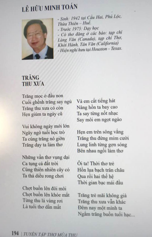 Born in 1942 in Cau Hai, Phu Loc, Thua Thien, central Vietnam Before 1975: Professor of Phan Rang High School, Vietnam became poet since 1968. His poems have been published in newspapers at home and in the United States. Currently resides in the city of Houston, Texas, USA. |