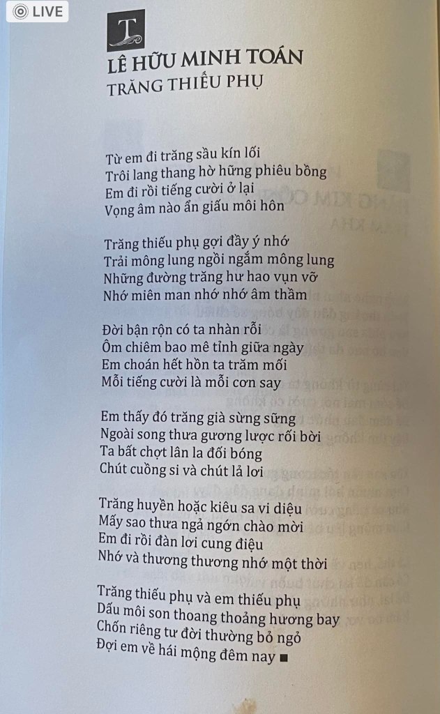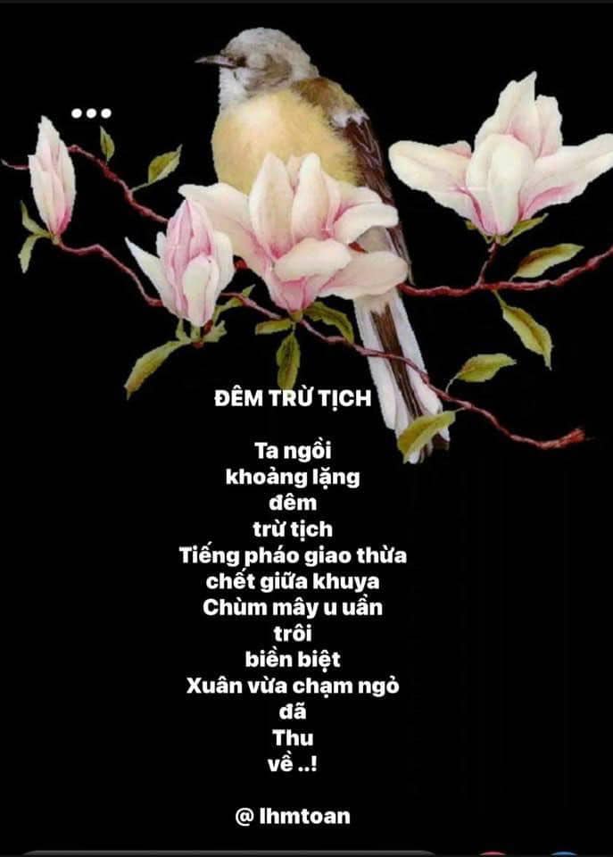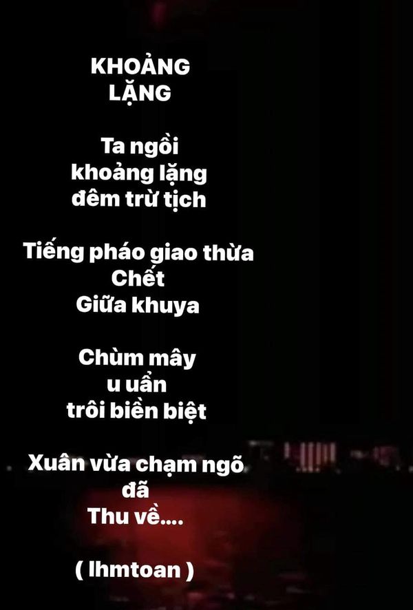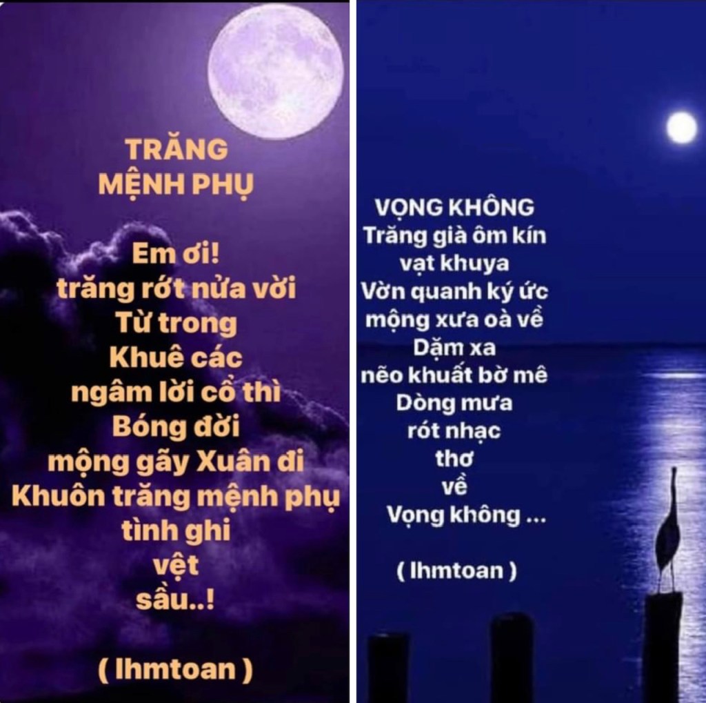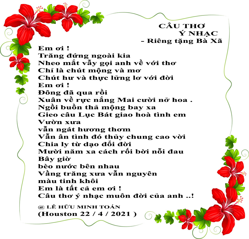 | TIẾC GIÊNG HAI Ta về thắp lại mùa trăng cũ Nghe những tàn phai chuyện đổi đời Vườn xưa một bóng sầu hoàng phế Cồn mây trắng mộng tiếc giêng hai @ Lê Hữu Minh Toán ( Houston 27/ 1 / 2022 ) |