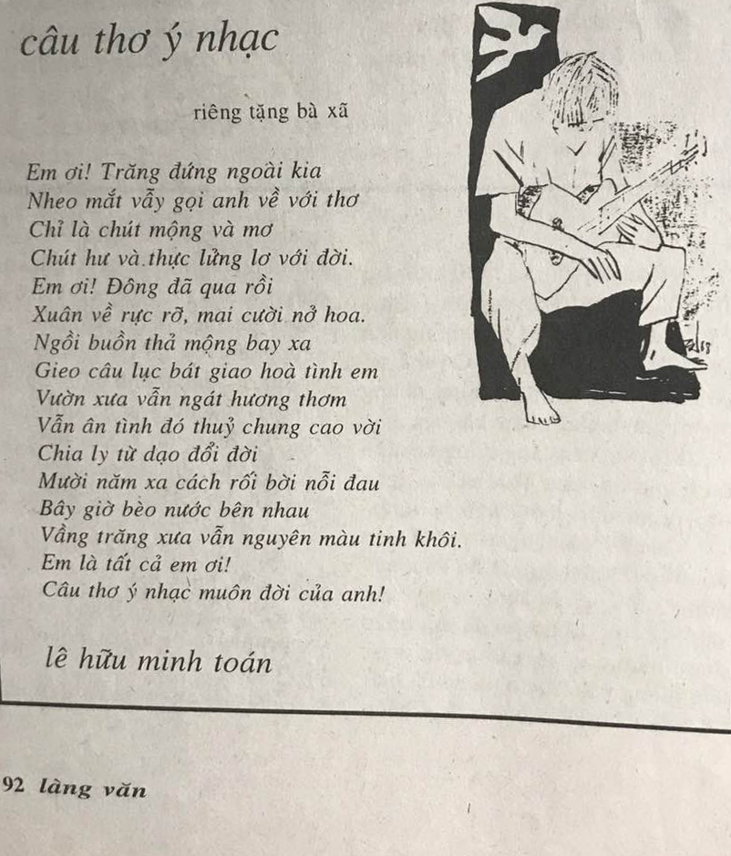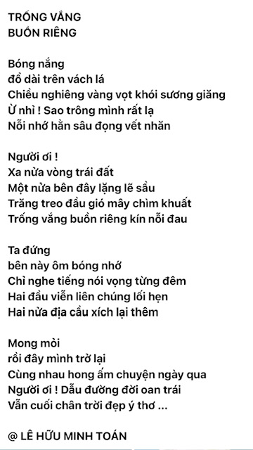 | TRĂNG VIỄN XỨ Trăng về trên xứ Thái Bâng khuâng nhớ quê nhà Buồn xa xăm vời vợi Phủ kín quanh hồn ta Một lần nghe biển hát Giữa trùng khơi mênh mông Ta nghe như tiếng khóc Từ cõi chết khôn cùng Việt Nam ! Việt Nam ơi ! Quê hương ta còn đó Mà rỉ máu từng ngày Mà đớn đau nghiệt ngã ..! Mẹ tóc trắng mù sương Cha nhăn nheo vầng trán Vợ mòn mõi thương chồng Trong lao tù khổ nạn Đất trời quay bão táp Từ tiếng khóc trẻ thơ Những hồn ma đói khát Đi vất vưởng không nhà Phải chăng ngày tận thế Nên dả thú bỏ rừng Xoả tóc về phố thị Nhuộm máu đỏ quê hương Đi – Phải đi – Đã đi Dù đi không hò hẹn Ta tin có ngày về Mùa Xuân xưa lại đến Ơi ! Quê hương Việt Nam Đêm trăng nầy thổn thức TỰ DO ! Trên hành lang Ta nghe lòng rạo rực …! @ LÊ HỮU MINH TOÁN Lê Hữu Minh Toán làm bài thơ”Trăng Viễn Xứ” vào cuối tháng 5 /1986 tại trại Tị nạn Thái Lan . |