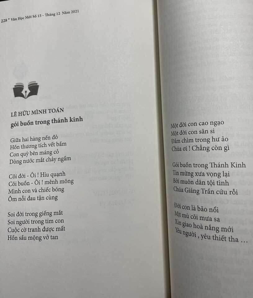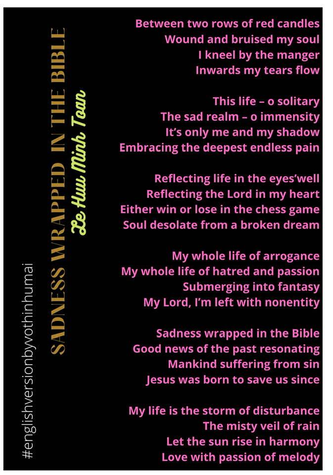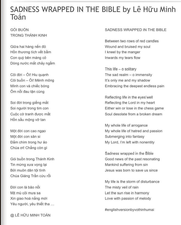 | Gói buồn trong Thánh kinh Giữa hai hàng nến đỏ Hồn thương tích vết bầm Con qùy bên Máng Cỏ Dòng nước mắt chảy ngầm Cõi đời, Ôi! Hiu quạnh Cõi buồn, Ôi! Mênh mang Mình con và chiếc bóng Ôm nổi đau tận cùng … Soi đời trong giếng mắt Soi người trong tim con Cuộc cờ tranh được mất Hồn sầu mộng vỡ tan Một đời con cao ngạo Một đời con sân si Đắm chìm trong hư ảo Chúa ơi! Chẵng còn gì Gói buồn trong Thánh Kinh Tin mừng xưa vọng lại Bỡi muôn dân tội tình Chúa Giáng Trần cứu rổi Đời con là bão nỗi Mịt mù cõi mưa sa Xin giao hòa nắng mới Yêu người – Yêu thiết tha …. Lê Hữu Minh Toán |
