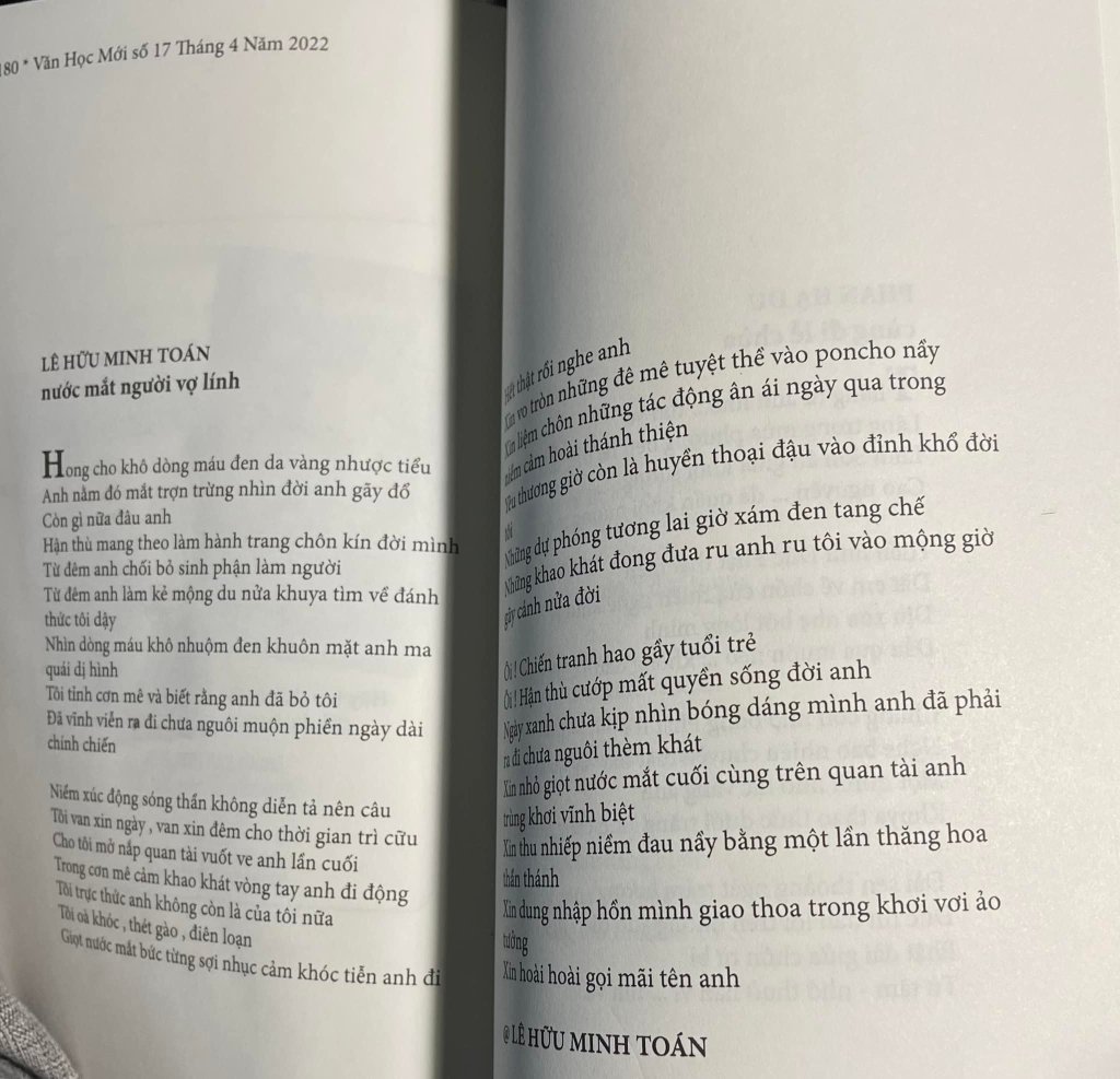 | NƯỚC MẮT NGƯỜI VỢ LÍNH Hong cho khô dòng máu đen da vàng nhược tiểu. Anh nằm đó, mắt trợn trừng nhìn đời anh gãy đổ. Còn gì nữa đâu anh. Hận thù mang theo làm hành trang chôn kín đời mình. Từ đêm anh chối bỏ sinh phận làm người. Từ đêm anh làm kẻ mộng du nửa khuya tìm về đánh thức tôi dậy. Nhìn dòng máu khô nhuộm đen khuôn mặt anh ma quái dị hình. Tôi tỉnh cơn mê và biết rằng anh đã bỏ tôi Đã Vĩnh viễn ra đi chưa nguôi muộn phiền ngày dài chính chiến Niềm xúc động sóng thần không diễn tả nên câu. Tôi van xin ngày, van xin đêm cho thời gian trì cữu. Cho tôi mở nắp quan tài vuốt ve anh lần cuối. Trong cơn mê cảm khao khát vòng tay anh di động. Tôi trực thức anh không còn là của tôinữa. Tôi oà khóc, thét gào, điên loạn. Giọt nước mắt bức từng sợi nhục cảm khóc tiễn anh đi… Hết thật rồi nghe anh. Xin vo tròn những đê mê tuyệt thế vào poncho này. Xin liệm chôn những tác động ân ái ngày qua trong niềm cảm hoài thánh thiện. Yêu thương giờ còn là huyền thoại đậu vào đỉnh khổ đời tôi Những dự phóng tương lai giờ xám đen tang chế Những khao khát đong đưa ru anh ru tôi vào mộng giờ gãy cánh nửa đời ..! Ôi! Chiến tranh hao gầy tuổi trẻ. Ôi! Hận thù cướp mất quyền sống đời anh. Ngày xanh chưa kịp nhìn bóng dáng mình anh đã phải ra đi chưa nguôi thèm khát. Xin nhỏ giọt nước mắt cuối cùng trên quan tài anh trùng khơi vĩnh biệt. Xin thu nhiếp niềm đau này bằng một lần thăng hoa thần thánh. Xin dung nhập hồn mình giao thoa trong khơi vơi ảo tưởng. Xin hoài hoài gọi mãi tên anh …!!! @ LÊ HỮU MINH TOÁN Houston- 14/ 3/ 2022 |