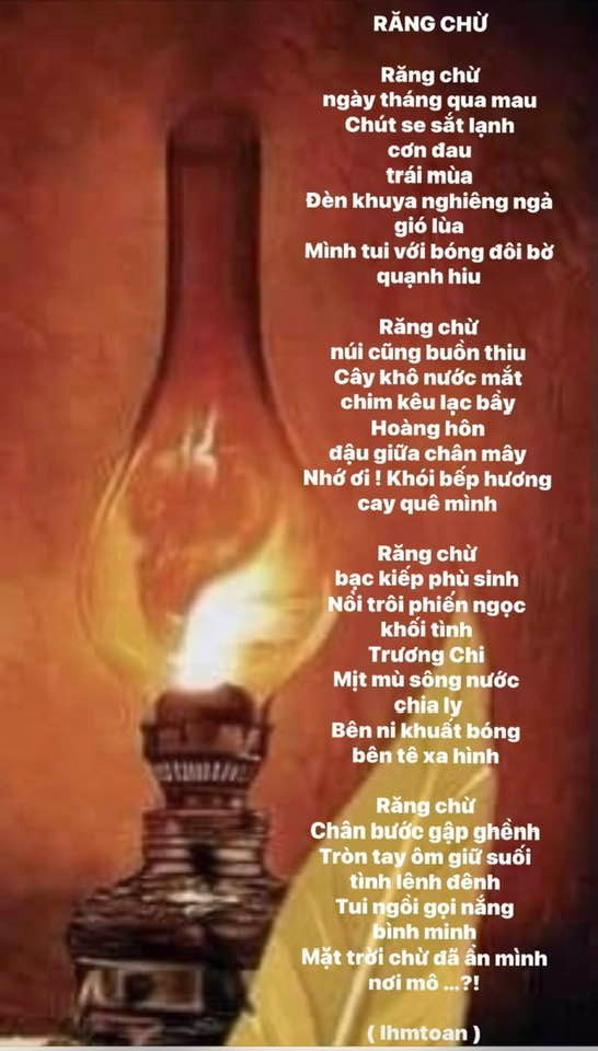 | Trưa nay , đọc một bài thơ của nhà thơ Phan Ni Tán viết về Huế để nhớ về cô em gái vừa qua đời , đồng thời gợi nhớ về những địa danh của xứ Huế ; tự dưng mình nhớ Về đất thần kinh Huế xưa một thời mình đã từng đi qua những nơi chốn thân quen ngày cũ . Mình xin đưa lên một bài thơ Lục bát với tựa đề “ RĂNG CHỪ “ và bức thì ảnh bài thơ nầy , kèm theo hình ảnh các cô Nữ sinh Đồng Khánh Huế đứng chờ đò ở bến đò Thừa Phủ ( hình mượn trên trang FB của Nt. Phan Ni Tấn ) cùng hình minh họa Cầu Tràng Tiền mượn trên net … Cũng xin gõ lại bài thơ : RĂNG CHỪ Răng chừ ngày tháng qua mau Chút se sắt lạnh cơn đau trái mùa Đèn khuya nghiêng ngã gió lùa Mình tui với bóng đôi bờ quạnh hiu Răng chừ núi cũng buồn thiu Cây khô nước mắt chim kêu lạc bầy Hoàng hôn đậu giữa chân mây Nhớ ơi ! Khói bếp hương cay quê mình Răng chừ bạc kiếp phù sinh Nổi trôi phiến Ngọc khối tình Trương Chi Mịt mù sông nước chia ly Bên tê khuất bóng bên ni xa hình Răng chừ chân bước gập ghềnh Tròn tay ôm giữ suối tình lênh đênh Tui ngồi gọi nắng bình minh Mặt trời chừ đã ẩn mình nơi mô …? @Lê Hữu Minh Toán ( Houston Nov. 29 , 2021 ) |