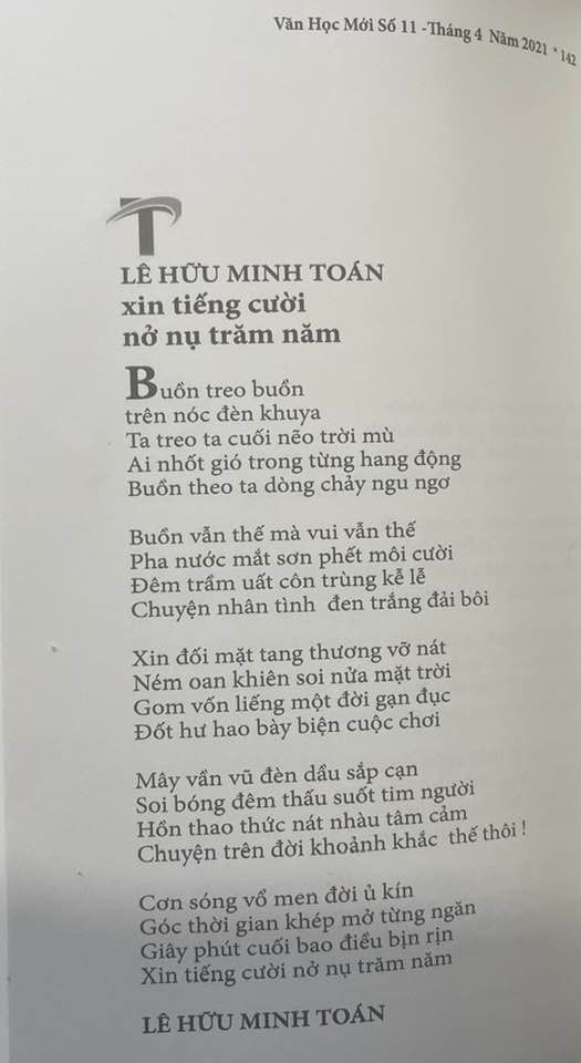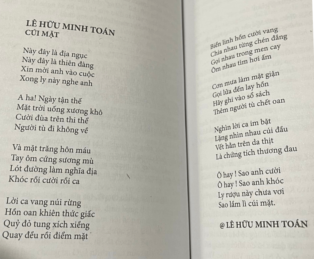 | CÚI MẶT – LHMT Xin đưa lên bài thơ CÚI MẶT đăng ở trang 140- 141 trong số báo VĂN HỌC MỚI ghi ở trên . Một bài thơ viết về những cái chết thật thương tâm của những người lính, hầu hết là những Sĩ quan Quân Lực Việt Nam Cộng Hoà đủ mọi cấp bậc và những binh chủng khác nhau …Một số không nhỏ , họ đã bỏ mạng , Vĩnh viễn không còn trở về với gia đình nữa vì rất nhiều nguyên nhân không may khác nhau đã xảy ra ở trong những TRẠI CẢI TẠO với thời gian quá dài như thế …!!! CÚI MẶT Này đây là địa ngục Này đây là thiên đàng Xin mời anh vào cuộc Xong ly này nghe anh A ha! Ngày tận thế Mặt trời uống xương khô Cười đùa trên thi thể Người tù đi không về Và mặt trăng hôn máu Tay ôm cứng sương mù Lót đường làm nghĩa địa Khóc rồi cười rồi ca Lời ca vang núi rừng Hồn oan khiên thức giấc Ngạ quỷ tung xích xiềng Quay đều rồi điểm mặt Biển linh hồn cười vang Chia nhau từng chén đắng Gọi nhau trong men cay Ôm nhau tìm hơi ấm Cơn mưa làm mặt giận Gọi lửa đến lay hồn Hãy ghi vào sổ sách Thêm người tù chết oan Nghìn lời ca im bặt Lặng nhìn nhau cúi đầu Vết hằn trên da thịt Là chứng tích thương đau Ô hay! Sao anh cười Ô hay! Sao anh khóc Ly rượu này chưa vơi Sao lầm lì cúi mặt..! @ LÊ HỮU MINH TOÁN ( Houston- 10 Tháng 5/ 2023 ) |