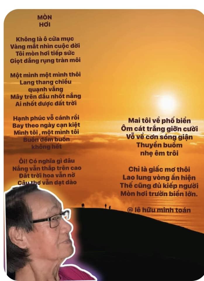 | MÒN HƠI Không là ô cửa mục Vàng mắt nhìn chuộc đời Tôi mòn hơi tiếp sức Giọt đắng rụng tràn môi Một mình, một mình thôi Lang thang chiều quạnh vắng Mây trên đầu nhốt nắng Ai nhốt được đất trời Hạnh phúc vỗ cánh rồi Bay theo ngày cạn kiệt Mình tôi, một mình tôi Buồn đếm buồn không hết Ôi! Có nghĩa gì đâu Nắng vẫn thắp trên cao Đất trời hoa vẫn nở Câu thơ vẫn dạt dào Mai tôi về phố biển Ôm cát trắng giỡn cười Vỗ về cơn sóng giận Thuyền buồm nhẹ êm trôi Chỉ là giấc mơ thôi Lao lung vòng ẩn hiện Thế cũng đủ kiếp người Mòn hơi trườn biển lớn… @ LÊ HỮU MINH TOÁN ( Houston- August. 26, 2022 ) |