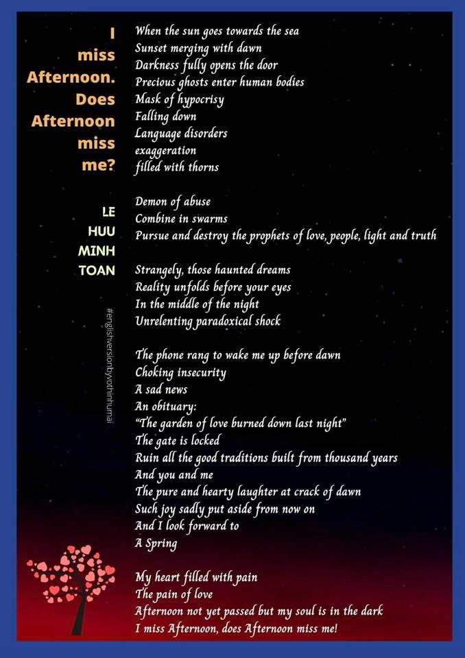 | Rất vui khi vừa nhận được bản dịch Tiếng Anh rất hay từ bài Thơ “ Ta Nhớ Chiều, Chiều Có Nhớ Ta “ của LHMT đã đưa lên FB cách đây gần một tháng do Nhà thơ Võ Thị Như Mai , hiện sinh sống và dạy học ở nước Úc , chuyển dịch . Xin cám ơn Cô giáo Võ Thị Như Mai rất nhiều , đồng thời gõ lại bài thơ Tiếng Việt này để quý anh chị và các bạn đọc cả hai bản Việt-Anh thuận tiện hơn . TA NHỚ CHIỀU, CHIÊU CÓ NHỚ TA Khi mặt trời đi về phía biển Hoàng hôn kín Bình minh Bóng tôi mở toang cánh cửa Ngạ quỷ nhập xác người Mặt nạ đạo đức giả hình Rớt xuống Những loạn ngôn loạn ngữ điêu ngoa Chở đầy gai nhọn Ác ma lộng hành kết hợp bầy đàn Truy cùng diệt tận ngôn sứ của tình yêu , con người, sự sáng và sự thật Lạ lẫm giấc mơ bị ám ảnh Hiện thực đã phơi bày trước mắt Giữa tàn khuya Chưa nguôi nỗi bàng hoàng nghịch lý Tiếng chuông điện thoại đánh thức lúc trời chưa kịp sáng Nghẹn ngào bất an Một tin buồn Một lời cáo phó: “Vườn tình đã cháy rụi đêm qua “ Cánh cổng khoá kín Lụn tàn những truyền thống tốt đẹp tự ngàn xưa Và anh và em Và Tiếng cười giòn tan mỗi sớm mai thức giấc Từ đây thôi đành khép lại Đợi chờ Một Mùa Xuân… Giá buốt tim đau Tình đau Chiều chưa qua mà hồn ta đêm tối Ta nhớ chiều. Chiều có nhớ ta ? @ Lê Hữu Minh Toán – Houston – June. 14, 2022 |