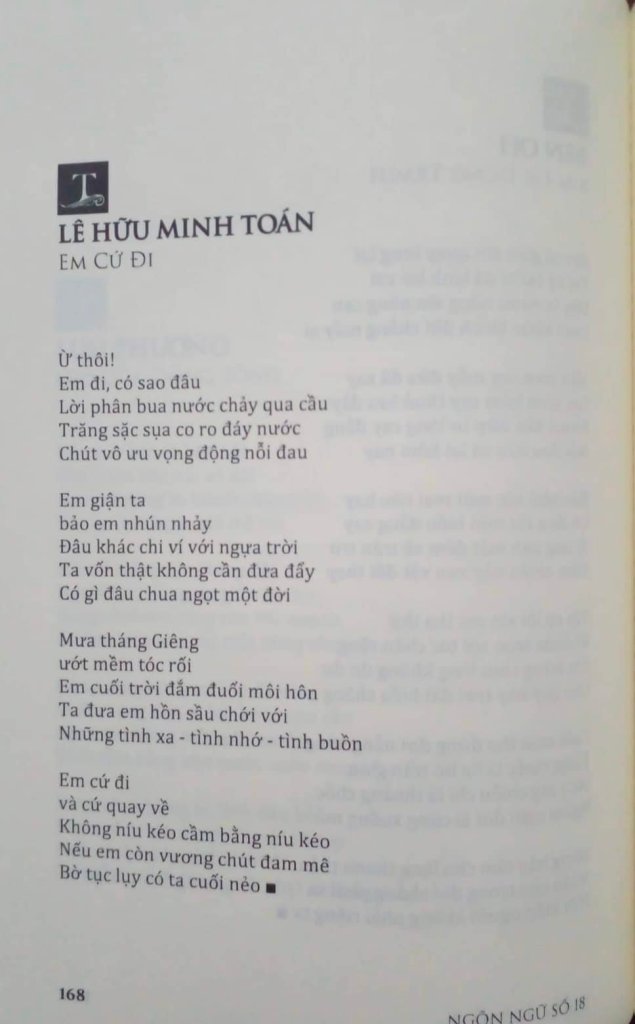 | EM CỨ ĐI Ừ thôi ! Em đi, có sao đâu Lời phân bua nước chảy qua cầu Trăng sặc sụa co ro đáy nước Chút vô ưu vọng động nỗi đau Em giận ta bảo em nhún nhảy Đâu khác chi ví với ngựa trời Ta vốn thật không cần đưa đẩy Có gì đâu, chua ngọt một đời Mưa tháng giêng ướt mềm tóc rối Em cuối trời đắm đuối môi hôn Ta đưa em hồn sầu chới với Những tình xa- tình nhớ- tình buồn Em cứ đi và cứ quay về Không níu kéo cầm bằng níu kéo Nếu em còn vương chút đam mê Bờ tục lụy có ta cuối nẻo… @ LÊ HỮU MINH TOÁN – Houston- March. 07, 2022 |