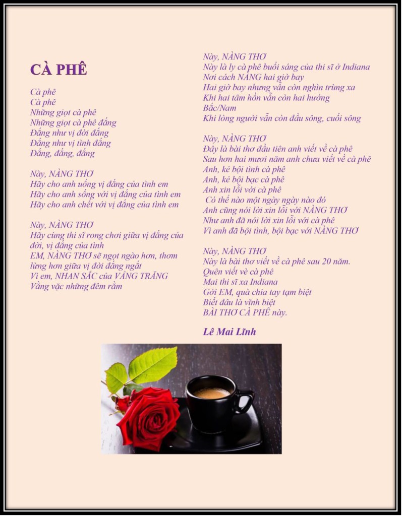 | Trước Giờ Bình Minh Này là bài thơ anh viết lúc bình minh Mới đầu ngày, giờ em uống cà phê sáng Bài thơ như một dấu chứng tình yêu Anh tặng em như một điều mật ước. Bài thơ, mỗi sáng mai chất chứa tình anh Tặng em, mối tình đầu trời trao ban Em, báu vật, trái tim anh là nơi em ngự tọa Trái tim anh,là bệ thờ Nàng Thơ, em. Em, vô thủy vô chung là tình yêu thi sĩ Em xưa, em nay, em sau, cũng một em Trước, sau, trong anh, em là một Em là một, trước sau, là Nàng Thơ. Em đang uống ly cà phê thứ mấy Có giọt nào dành cho thi sĩ Anh, gã tình sĩ làm thơ tình hết sẩy Dành tặng em, mối tình thi ca. Em, cứ tiếp tục uống cà phê Anh, cứ tiếp tục làm thơ tặng em Như giữa chúng ta có điều mật ước Anh làm thơ, em uống cà phê. 4/5/2014 Lê Mai Lĩnh |