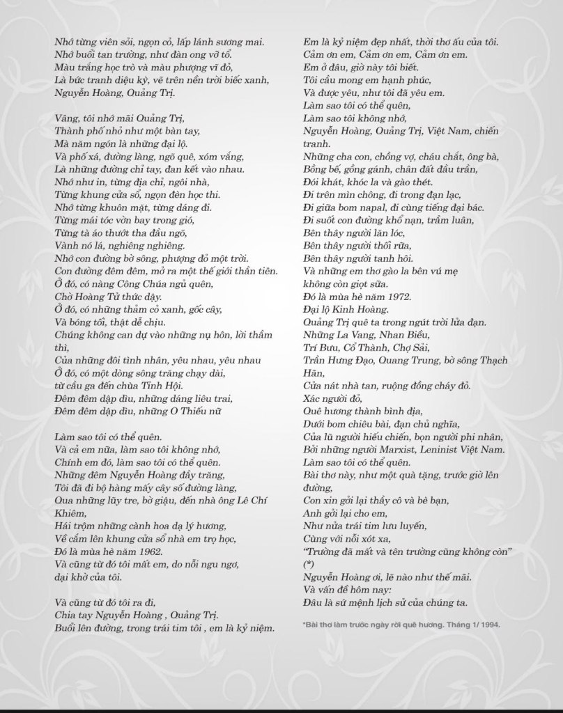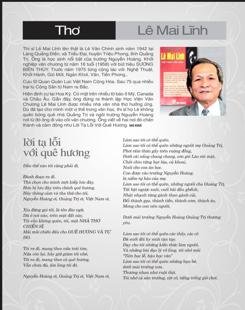 | LỜI TẠ LỖI VỚI QUÊ HƯƠNG Dẫu thế nào tôi cũng phải đi Đành đoạn ra đi Thà chọn cho mình một kiếp lưu đày Hơn bị lưu đày trên chính quê hương Hãy thông cảm và tha thứ cho tôi Nguyễn Hoàng ơi, Việt Nam ơi, Việt Nam ơi Xin đừng gọi tôi là tên đào ngủ Dù ở nơi nào trên mặt đất này Tôi không quên, tôi, một NHÀ THƠ CHIẾN SĨ Mãi mãi chiến đấu cho QUÊ HƯƠNG VÀ TỰ DO Tôi ra đi mang theo nửa trái tim Nửa còn lại giữ giùm tôi nhé Tôi ra đi mang theo cả quê hương Vãn chưa đủ ấm lòng tôi đó Nguyễn Hoàng ơi, Quảng Trị ơi, Việt Nam ơi Làm sao tôi có thể quên Làm sao tôi có thể quên những người mẹ Quảng Trị Phơi tấm thân gầy trên ruộng đồng Dưới cái nắng chang chang cơn gió Lào rát mặt Chắt chiu từng hạt lúa củ khoai Nuôi cho con ăn học Con được vào trường Nguyễn Hoàng là niềm tự hào của mẹ Làm sao tôi co thể quên những người cha Quảng Trị Tất bật ngược xuôi cuối bãi đầu ghềnh Nhặt nhạnh từng gánh than gánh củi Đổi thành gạo thành tiền,thành cơm, thành áo Mong cho con nên người Dưới mái trường Nguyễn Hoàng Quảng Tri thương yêu Làm sao tôi có thể quên các thầy các cô Đã suốt đời hy sinh tận tụy Dạy cho tôi những kiến thức làm người Và những bài đạo lý vỡ lòng tôi nhớ mãi “Tiên học lễ, hậu học văn” Làm sao tôi có thể quên những bạn bè dưới mái trường xưa Thương nhau như ruột thịt Tôi nhớ cả sân trường, cột cờ, tiếng trống giờ chơi Nhớ từng viên sỏi, ngọn cỏ lấp lánh sương mai Nhớ buổi tan trường như đàn ong vỡ tổ Màu trắng học trò và màu phượng vĩ đỏ Là bức tranh diệu kỳ vẽ trên nền trời biếc xanh Nguyễn Hoàng ơi, Quảng Trị ơi Vâng tôi nhớ mãi Quảng Trị Thành phố nhỏ như một bàn tay Mà năm ngón là những đại lộ Và phố xá, đường làng, ngõ quê, xóm vắng Là những đường chỉ tay đan kết vào nhau Nhớ như in từng địa chỉ ngôi nhà Từng khung cửa sổ, ngọn đèn học thi Nhớ từng khuôn mặt, từng dáng đi Từng mái tóc vờn bay trong gió Từng tà áo thướt tha đầu ngõ Vành nó lá nghiêng nghiêng Những con đường bờ sông phượng đỏ một trời Con đường đêm đêm mở ra một thế giới thần tiên Ở đó có nàng Công Chúa ngủ quên Chờ Hoàng Tử thức dậy Ở đó có những thảm cỏ xanh, gốc cây Và bóng tối thật dễ chịu Chúng không can dự vào những nụ hôn, lời thầm thì Của những đôi tình nhân yêu nhau, yêu nhau Ở đó có một dòng trăng chạy dài từ cầu ga đến chùa Tỉnh Hội Đêm đêm dập dìu những dáng liêu trai Làm sao tôi có thể quên Và cả em nửa, làm sao tôi không nhớ Chính em đó, làm sao tôi có thể quên Những đêm Nguyễn Hoàng đầy trăng Tôi đi bộ hàng mấy cây số đường làng Qua những lũy tre bời dậu đến nhà ông Lê Chí Khiêm Hái trộm những cành hoa dạ lý hương Về cắm lên cửa sổ nhà em trọ học Đó là mùa hè năm 1962 Và cũng từ đó tôi mất em vì nỗi ngu ngơ dại khờ của tôi Và cũng từ đó tôi ra đi Chia tay Nguyễn Hoàng Quảng Trị Buổi lên đường, trong trái tim tôi em là kỷ niệm Em là kỷ niệm đẹp nhất thời thơ ấu của tôi Cảm ơn em, Cảm ơn em, Cảm ơn em. Em ở đâu, giờ này tôi biết Tôi cầu mong em hạnh phúc Và được yêu như tôi đã yêu em Làm sao tôi có thể quên Làm sao tôi không nhớ Nguyễn Hoàng, Quảng Trị, Việt Nam chiến tranh Những cha con, chồng vợ, cháu chắt, ông bà Bồng bế, gồng gánh, chân đất đầu trần Đói khát khóc la và gào thét Đi trên mìn chông, đi trong đạn lạc Đi giữa bom napal, đi cùng tiếng đại bác Đi suốt con đường khổ nạn, trầm luân Bên thây người lăn lóc Bên thây người thối rữa Bên thây người tanh hôi Và những em thơ gào la bên xác mẹ không còn giọt sửa Đại lộ Kinh Hoàng Quảng Trị quê tôi trong ngút trời lửa đạn Những La Vang, Nhan Biều Trí Bưu, Cổ Thành, Chợ Sải Trần Hưng Đạo, Quang Trung, bờ sông Thạch Hãn Cửa nát nhà tan, ruộng đồng cháy đỏ Xác người đỏ Quê hương thành bình địa Dưới bom chiêu bài, đạn chủ nghĩa Của lũ người hiếu chiến, bọn người phi nhân Bởi người Marxist, Leninist Việt Nam Làm sao tôi có thể quên Bài thơ này như một quà tặng trước giờ lên đường Con xin gởi lại thầy cô và bè bạn Anh gởi lại cho em Như nửa trái tim lưu luyến Cùng với nỗi xót xa “Trường đã mất và tên trường cũng không còn” (*) Nguyễn Hoàng ơi lẽ nào như thế mãi Và vấn đề hôm nay Đâu là sứ mệnh của chúng ta Lê Mai Lĩnh (*) Lời thầy Thái Mộng Hùng |