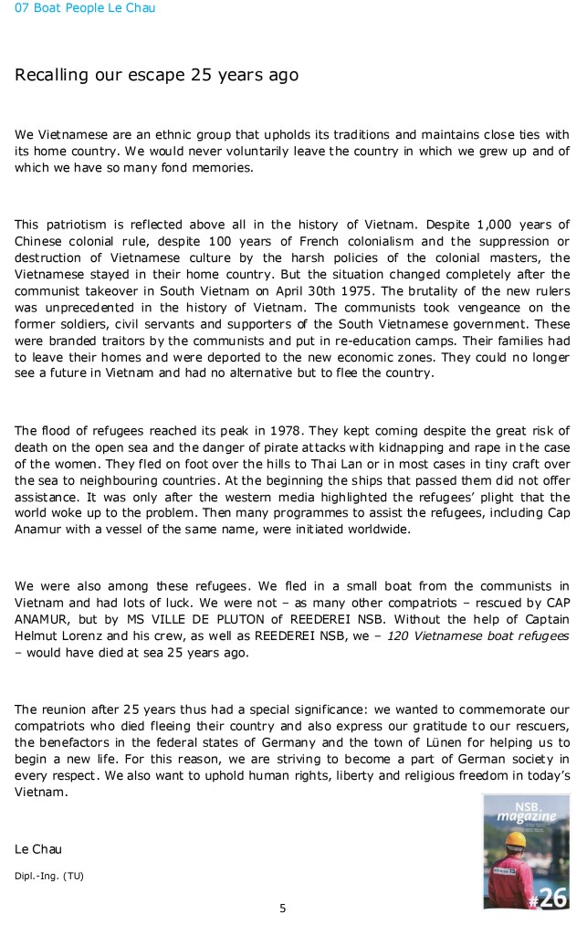 | Bài viết của Lê Ngọc Châu liên quan đến Người Việt tị nạn được cứu mạng trên đường vượt biển tìm Tự Do sau 1975 Đức ngữ + Anh ngữ |
