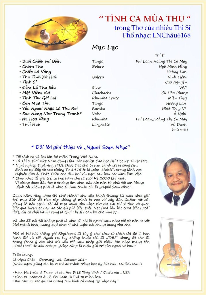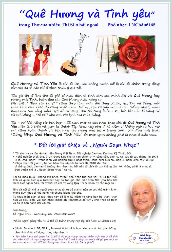 | Tiểu sử Lê-Ngọc Châu là tên thật, người miền Trung. Để tránh trùng hợp vì thấy trên internet có nhiều người cùng tên nên sử dụng bút hiệu LNChâu6168 khi thực hiện youtube và soạn nhạc. Cựu học sinh trường Trung học Công Lập Cường Để Qui Nhơn. Cựu sinh viên du học thời Việt Nam Cộng Hòa. Theo học Đại Học Đức, tốt nghiệp BSc và MSc. Nghề nghiệp: Diplomingenieur (TU) Sau 30-04-1975 xin tỵ nạn chính trị, hiện định cư tại Đức. Sau khi ra trường làm việc cho hãng chế tạo xe hơi BMW có bản doanh tại Munich, phần hành nghiên cứu và phát triển (Research & Development), trọng điểm là Phát Triển cho đến khi (tự ý xin) nghỉ hưu non. Hiện giờ chính thức nghỉ hưu. Hobby: Thích giải trí thanh tao như thực hiện Slide Show, Video Clip ect … viết văn, sọan nhạc mục đích để giải trí và học hỏi thêm tiếng Việt và ngoại ngữ. Thành viên Ban Biên Tập Báo Viên Giác, Tạp Chí của Kiều Bào và Phật Tử Việt Nam Tỵ Nạn tại Cộng Hoà Liên Bang Đức, phát hành tại Hannover/Đức. Thành viên Câu Lạc Bộ Tình Nghệ Sĩ (Mỹ). Đã viết một số bài tạp ghi, đoản văn, dịch thuật, biên khảo và bình luận về thời sự, chính trị Đức được phổ biến trên vài nhật báo ở Mỹ, Websites, Đặc San và Tuyển Tập. Vì yêu thích Âm Nhạc, nên trước khi nghỉ sưu non chọn nhạc làm hobby và tuy chỉ là nghiệp dư (111% không phải là ca-nhạc đàn sĩ vì tự học mò hàm thụ cấp tốc mà ông Thầy là google) cũng đã xí xọn phổ thơ, soạn tài tử thành một số bản nhạc Tình, vài bài hát về Quê Hương, Dân Tộc. |