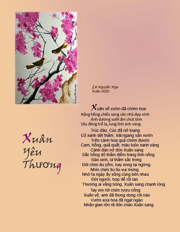 | Mùa Xuân nói với em Hoa đang khoe sắc thắm Chim tiu tít đến thăm Trong vườn xưa hẹn ước Năm xưa tình yêu thầm Nụ tâm xuân khoe sắc Hoa thắm xinh đón chào Cảnh vườn tươi trong nắng Dáng em đẹp ngất ngây Cúc vàng ghen sắc áo Chiếc áo xuân đón chàng Hoa Hồng ghen sắc thắm Đẹp thua làn môi nàng Mùa Xuân nói với em Tình yêu chàng thắm đẹp Người yêu em nhớ mãi Chẳng bao giờ quên em Mùa Xuân báo tin thêm Tình quân đang sắp tới Mang tình yêu tuyệt vời Đón em ngày vui mới Em nghe Xuân chợt tới Trong hương trinh ngạt ngào Nghe tim nồng rộn rã Trong tay người tình lang. Lê Nguyễn Nga Xuân 2023 |