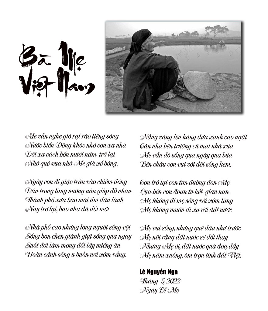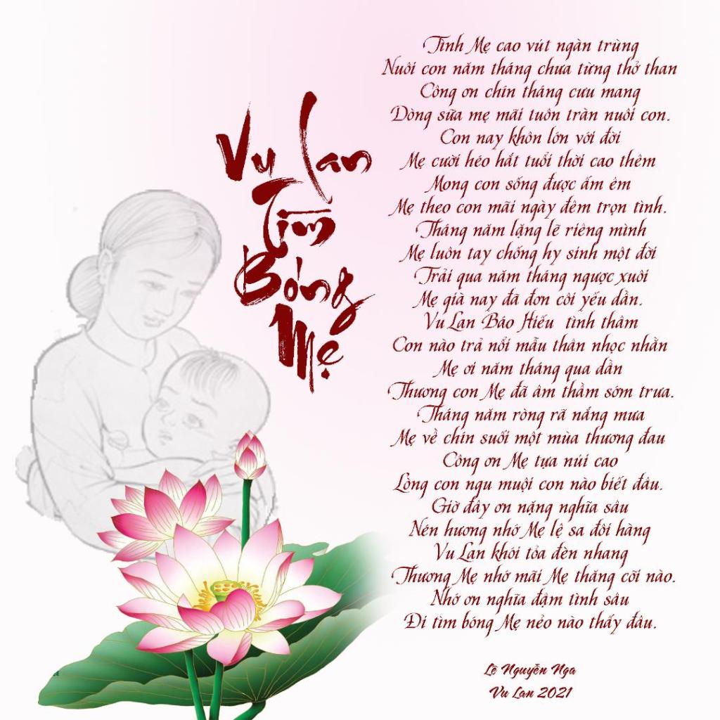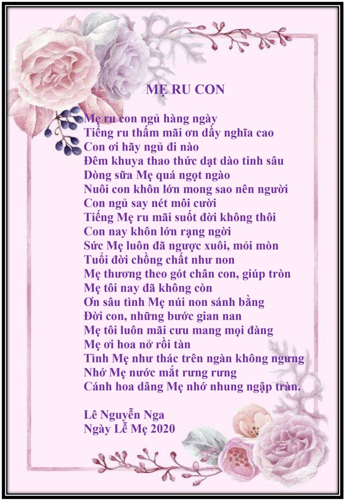 | MẸ RU CON Mẹ ru con ngủ hàng ngày Tiếng ru thấm mãi ơn dầy nghĩa cao Con ơi hãy ngủ đi nào Đêm khuya thao thức dạt dào tinh sâu Dòng sữa Mẹ qúa ngọt ngào Nuôi con khôn lớn mong sao nên người Con ngủ say nét môi cười Tiếng Mẹ ru mãi suốt đời không thôi Con nay khôn lớn rạng ngời Sức Mẹ luôn đã ngược xuôi, mỏi mòn Tuổi đời chồng chất như non Mẹ thương theo gót chân con, giúp tròn Mẹ tôi nay đã không còn Ơn sâu tình Mẹ núi non sánh bằng Đời con, những bước gian nan Mẹ tôi luôn mãi cưu mang mọi đàng Mẹ ơi hoa nở rồi tàn Tình Mẹ như thác trên ngàn không ngưng Nhớ Mẹ nước mắt rưng rưng Cánh hoa dâng Mẹ nhớ nhung ngập tràn. Lê Nguyễn Nga Ngày Lễ Mẹ 2020 |
