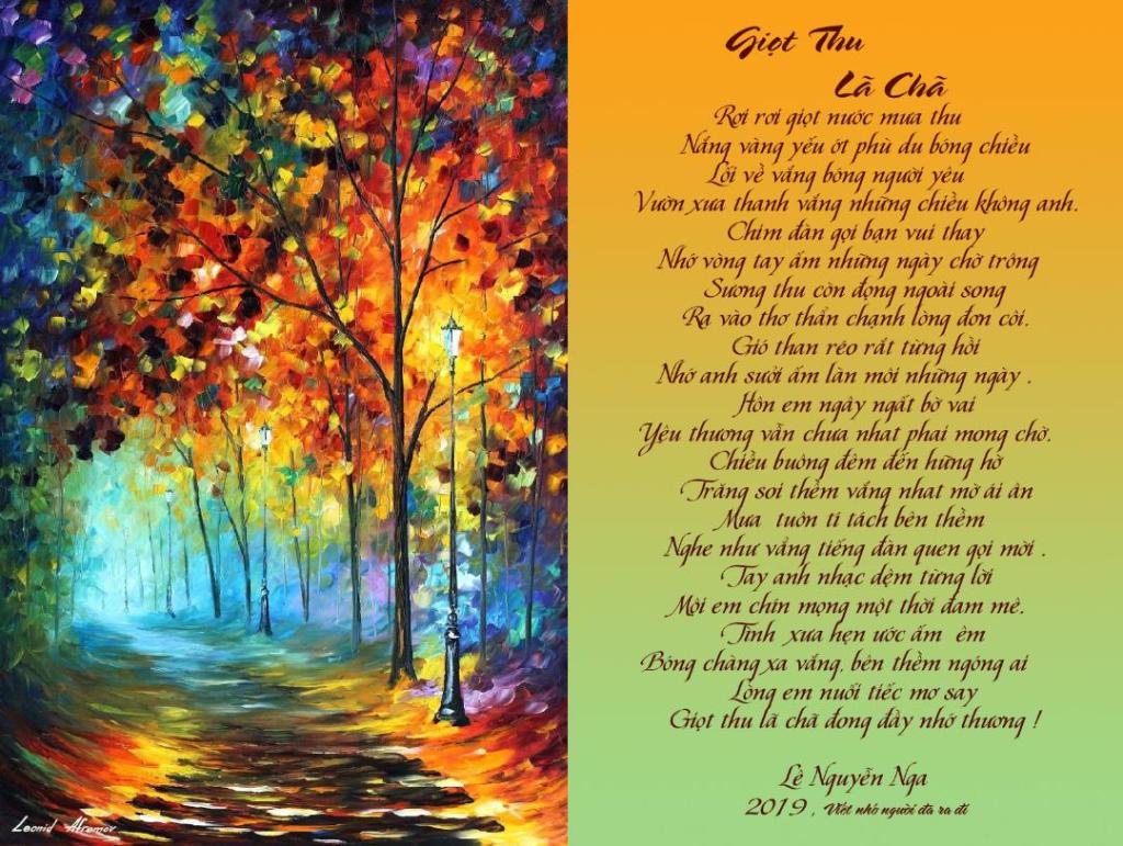 | Mùa Thu Trong Mơ Rừng thu vàng thay áo Sắc thu đẹp nõn nà Con đường xưa ta hẹn Rừng xanh đã đổi màu. Đến tìm em nơi đây Tiếng cành cây rơi gẫy Bóng hình xưa chợt thấy Ta gặp em nơi này. Tà áo em xanh thẫm Mắt lắng buồn xa xăm Em đứng giữa rừng thu Lòng vấn vương âm thầm. Nắng thu hồng đôi má Gió thu vờn tóc mây Anh đưa bàn tay gầy Vuốt tóc em bay bay. Ngồi vói anh nơi đây Vui bên nhau phút giây Sưởi lòng anh ấm lại Chìm vào giấc mơ say. Lê Nguyễn Nga |