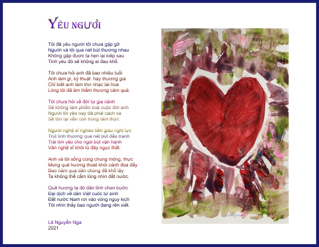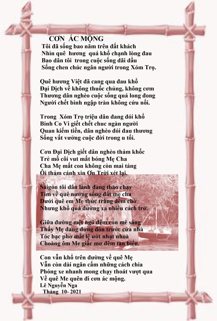 | CƠN ÁC MỘNG Tôi đã sống bao năm trên đất khách Nhìn quê hương quá khổ chạnh lòng đau Bao dân tôi trong cuộc sống dãi dầu Sống chen chúc ngân người trong Xóm Trọ. Quê hương Việt đã cang qua đau khổ Đại Dịch về không thuốc chủng, không cơm Thương dân nghèo cuộc sống quá long đong Người chết binh ngập tràn không cứu nổi. Trong Xóm Trọ triệu dân đang đói khổ Binh Co Vi giết chết chuc ngàn người Quan kiếm tiền, dân nghèo đói đau thương Sống vất vưởng cuộc đời trong u tối. Cơn Đại Dịch giết dân nghèo thảm khốc Trẻ mồ côi vut mất bóng Mẹ Cha Cha Mẹ mất con không còn mai táng Ôi thảm cánh xin Ơn Trời xét lại. Saigon tôi dân lành đang tháo chạy Tim về quê nương sống đất mẹ cha Dưới quê em Me thức trắng đêm chờ Nhưng khổ quá đường xa nhiều cách trở. Giữa đường mệt ngủ đêm con mê sảng Thấy Mẹ đang đứng đón trước cửa nhà Tóc bạc phơ mắt lệ ướt nhạt nhoà Choàng ôm Me giấc mơ đêm tan biến. Con vẫn khổ trên đường về quê Mẹ Vẫn còn dài ngăn cấm những cách chia Phóng xe nhanh mong chạy thoát vượt qua Về quê Me quên đi cơn ác mộng. Lê Nguyễn Nga Tháng 10- 2021 |